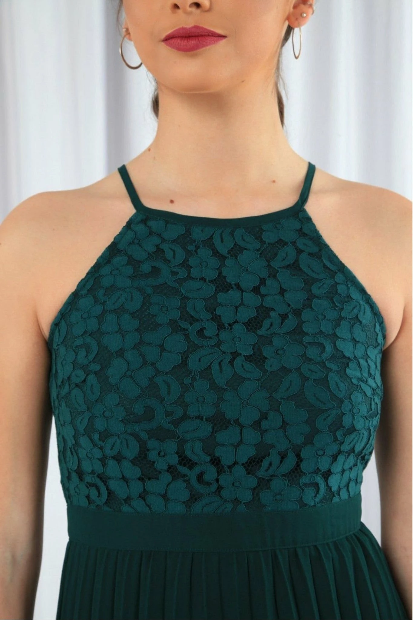 This beautiful jewel green dress is wedding guest approved and fit for many other fancy occasions. Featuring a lace upper body, halter neck neckline and pleated chiffon skirt. This dress is fully lined and has an invisible zip fastening.