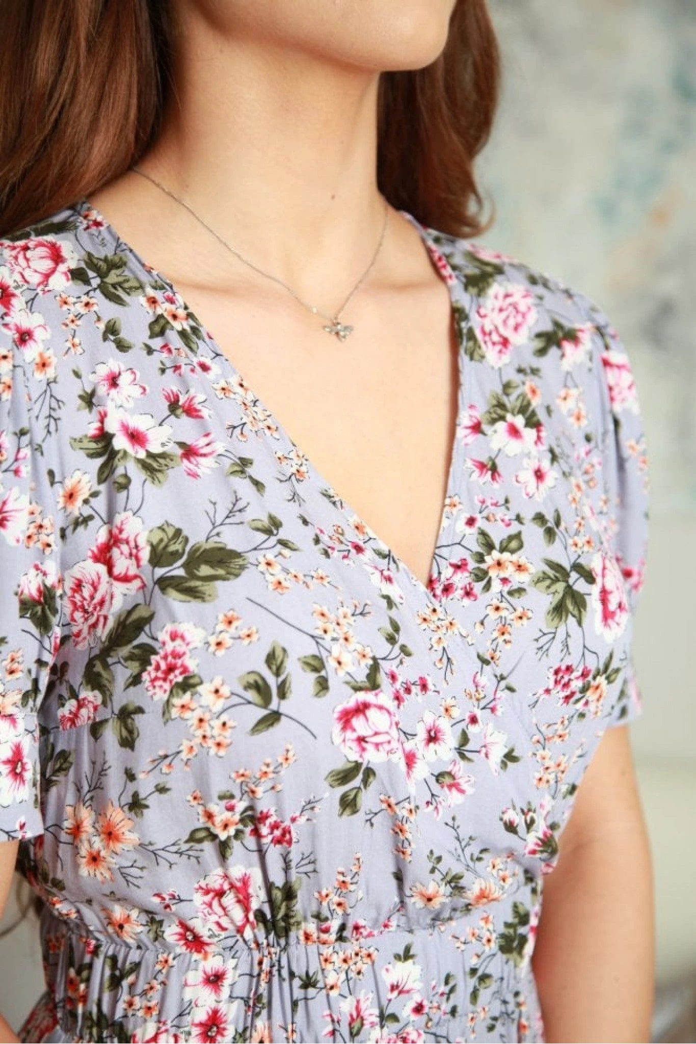 This floral print midi dress features a wrap front design with short puff sleeves. A wide elasticated waist and a keyhole button closure make this dress a cute and comfortable fit.