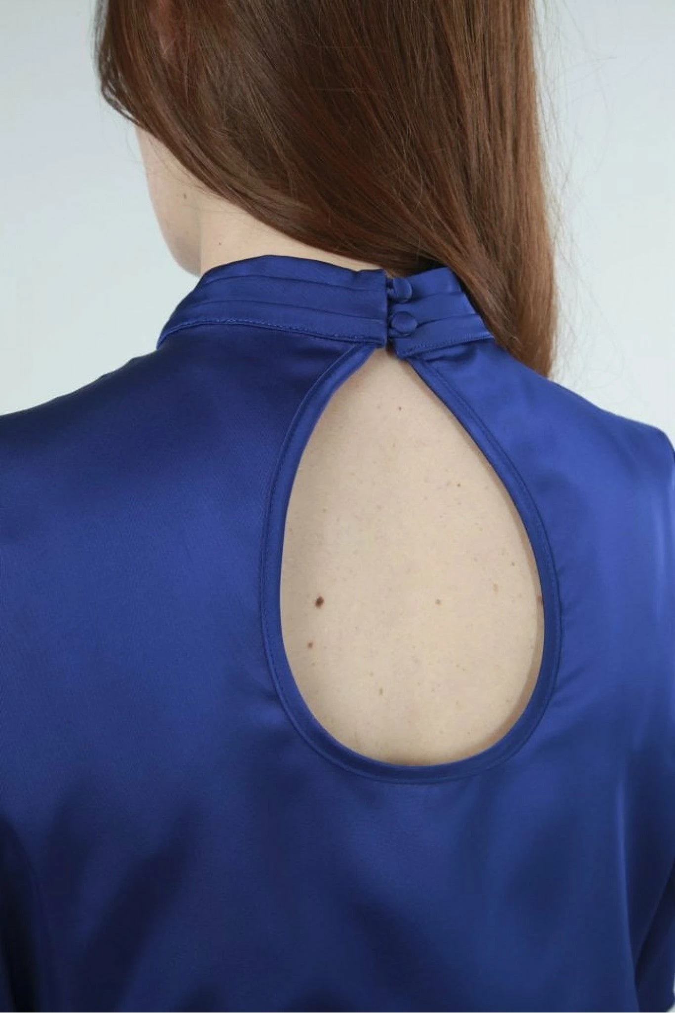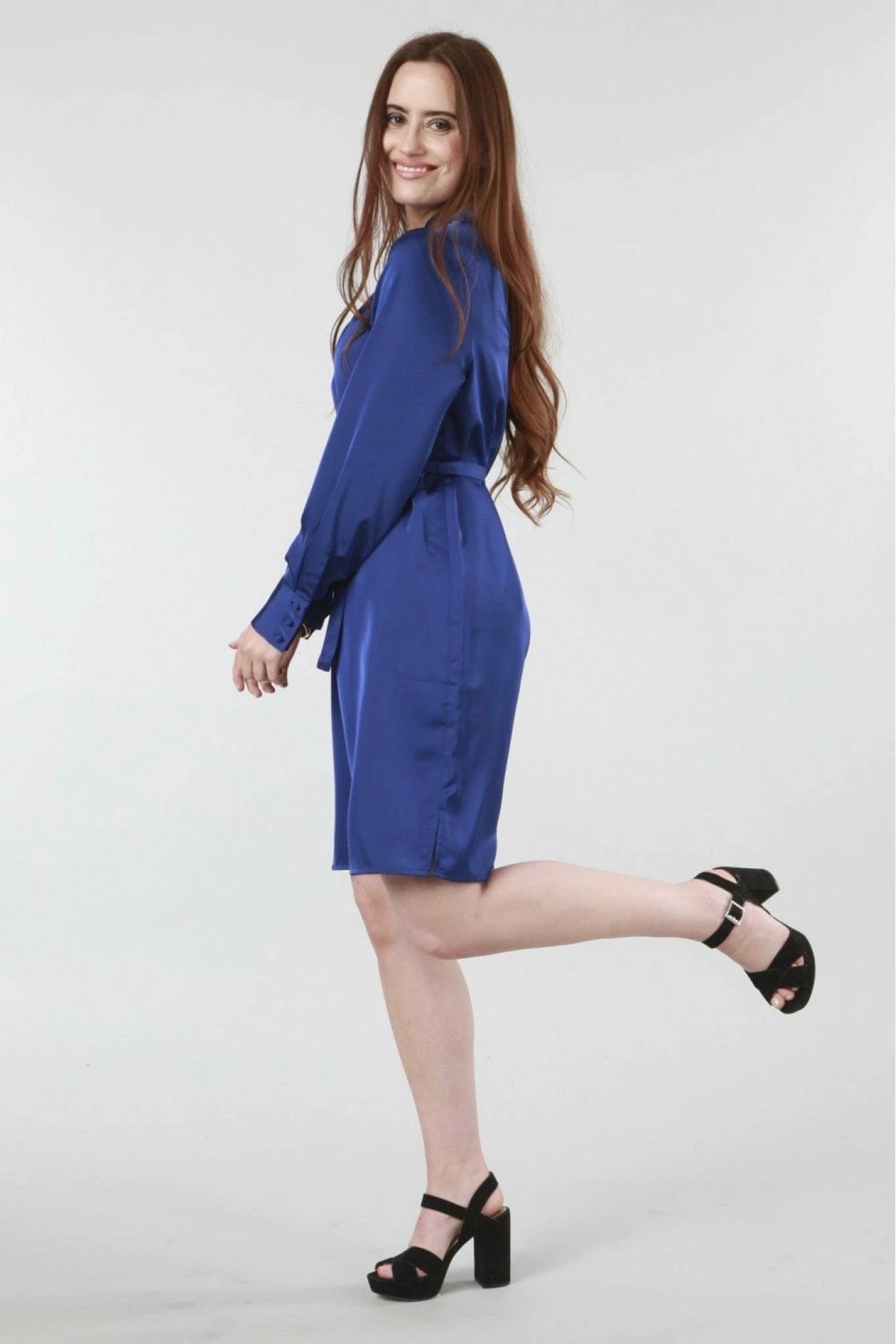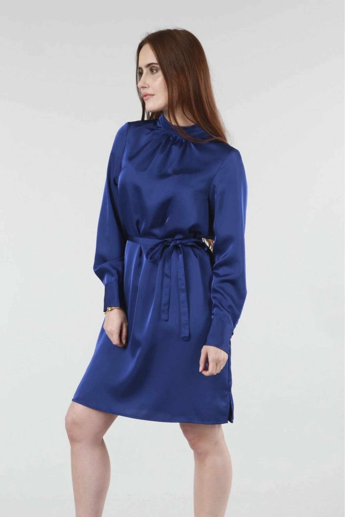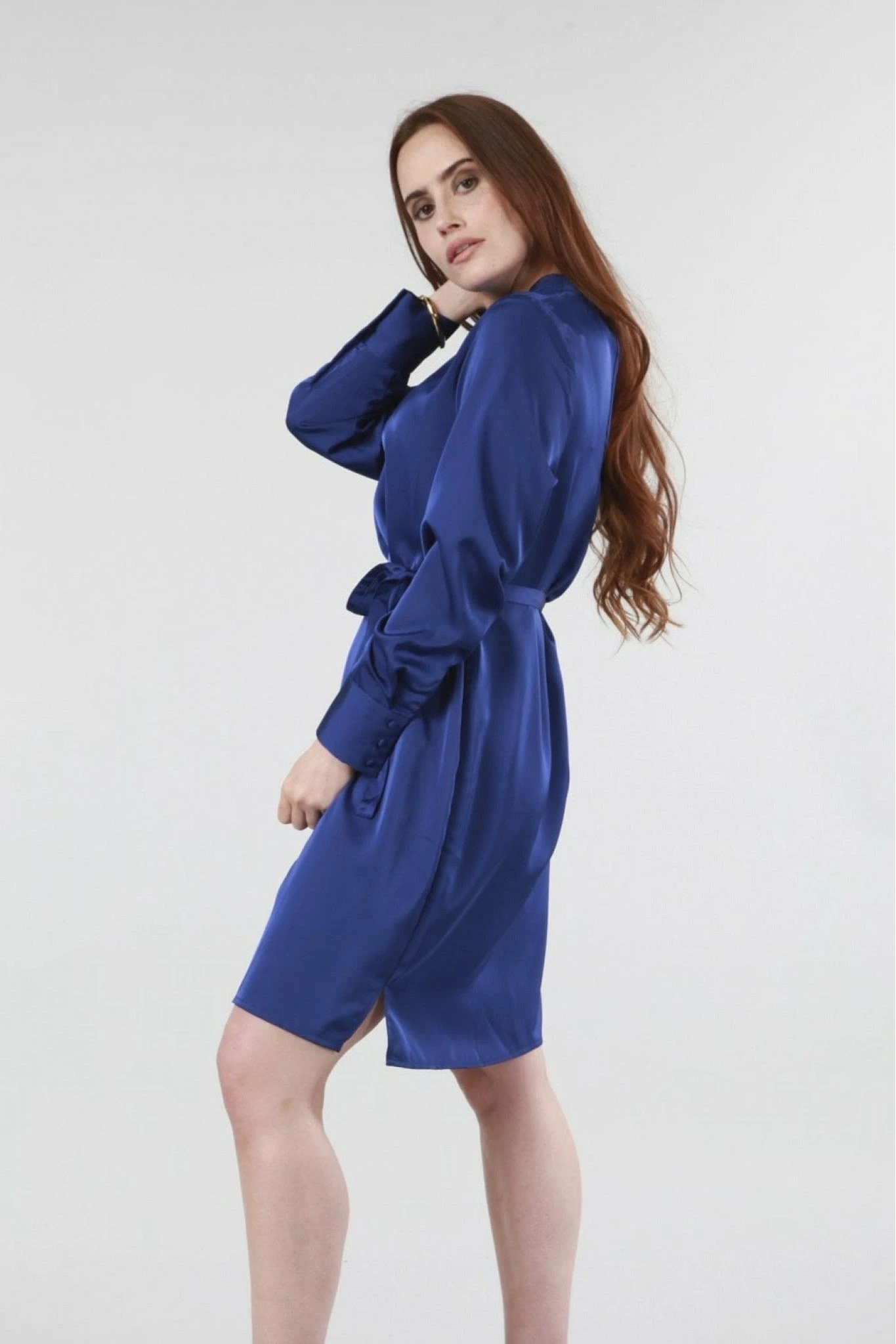 This beautiful satin belted shift dress is perfect for fancy occasions such as weddings or a cute date night out. This knee length dress features long sleeves, a high neck with gathered detail and button up cuff detail. The back of the dress is finished with an elegant keyhole back and the removable waist belt that can transform this dress from an A-line to a more contoured shape.