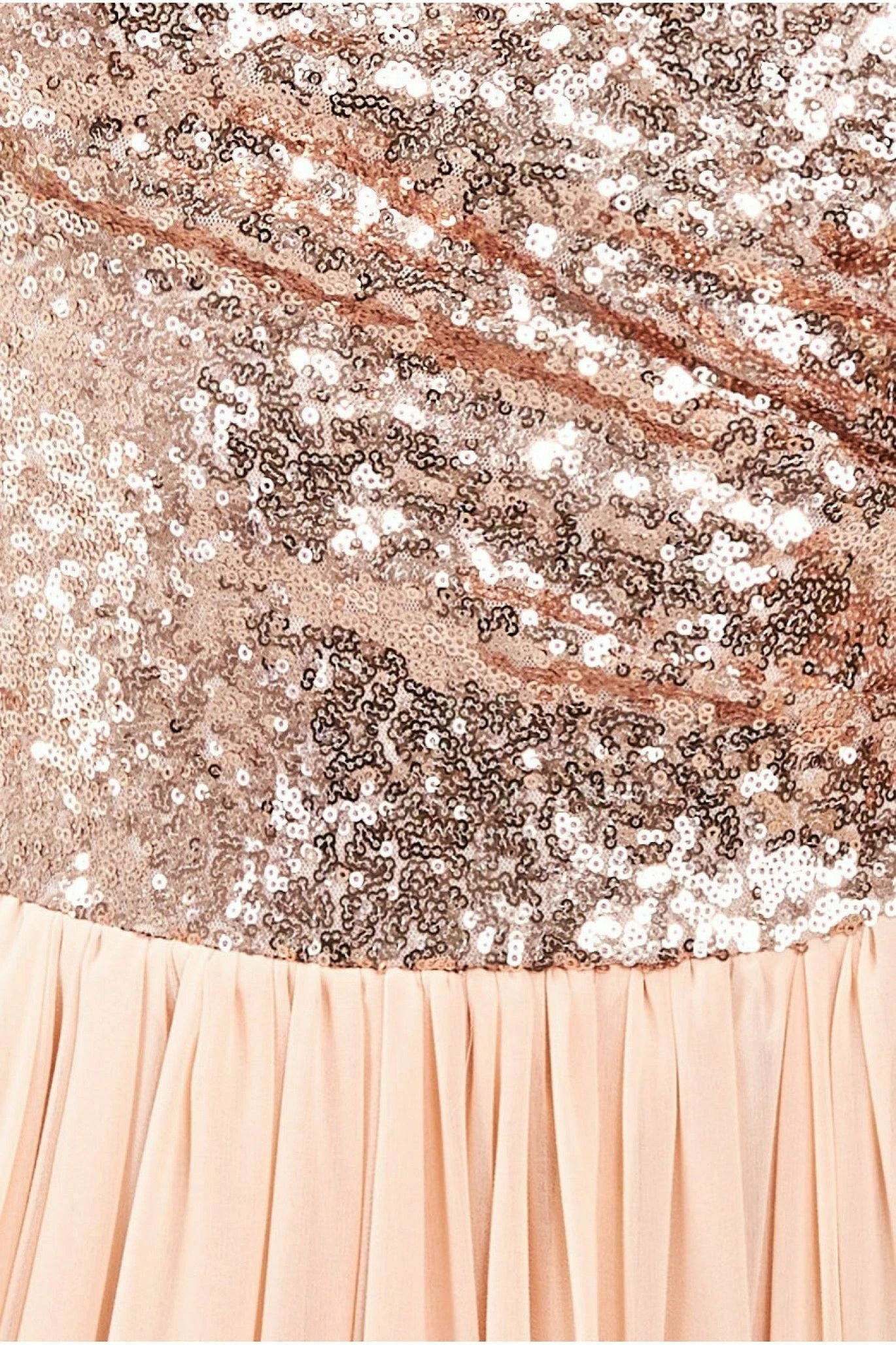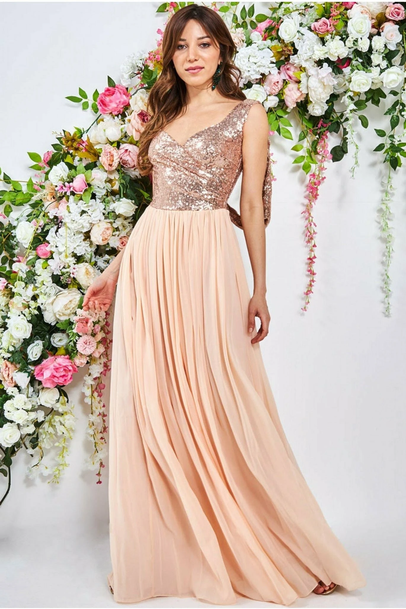This glamorous dark green maxi dress is the statement piece you need in your special occasion wardrobe. The fitted sequined bodice comes with a cowl back for the ultimate sultry look while the flare chiffon skirt guarantees free body movement throughout the evening. A clever choice for bridesmaids, wedding guests, proms and any other special occasion you have coming up. In its glossy champagne colour, this long evening dress will give you a royal feel. At its affordable price, this sequin dress is simply beautiful. Complete the look with diamante drop earrings and a matching clutch bag.
