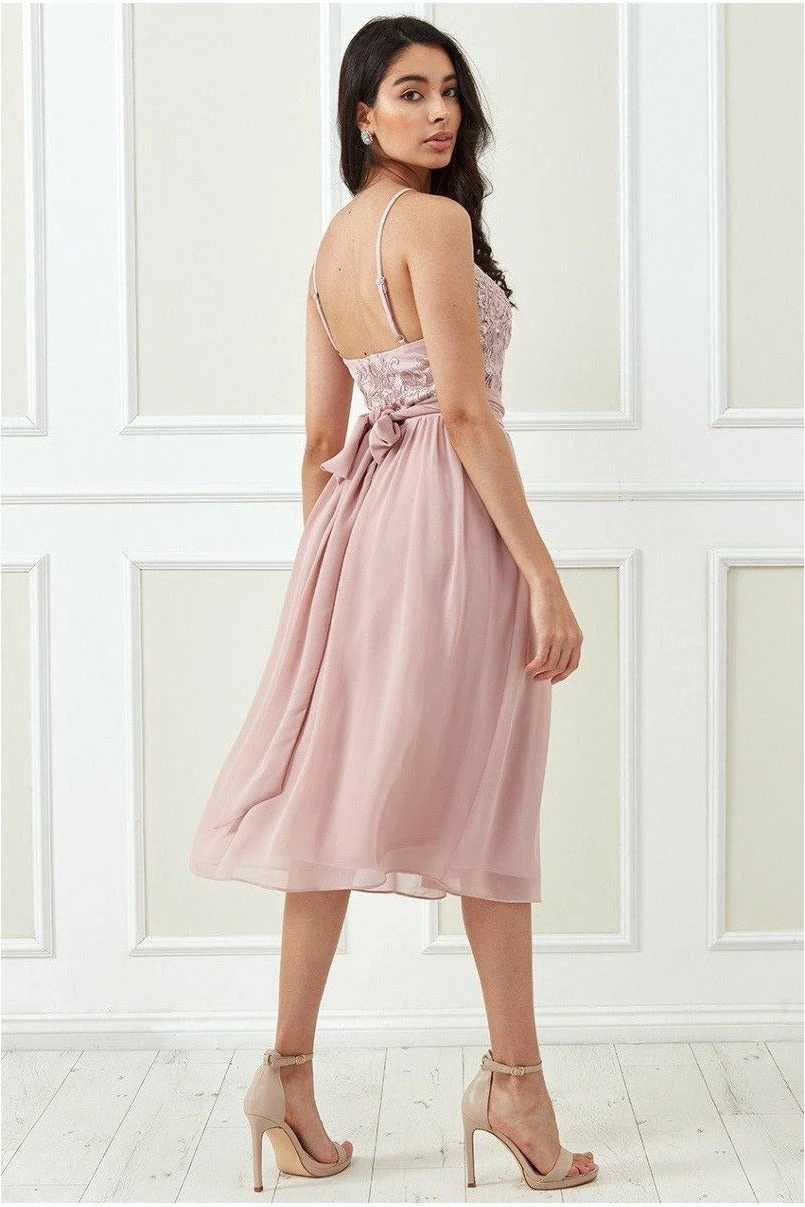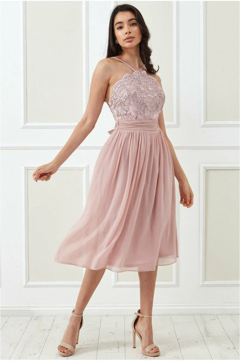 Goddiva have something to make you smile about this summer with this darling lace halter neck chiffon midi skirt dress. This fairy tale inspired midi dress is the perfect piece to add to your occasion collection this summer. With its shorter length, chiffon skirt and embroidered lace bodice, this blush party dress will make going back out again that little bit easier. Its halter neck style and open back detailing makes this pink dress the perfect choice for summer. A winning choice for wedding guests, nights out, date nights and any semi-formal party you have pencilled in your diary.