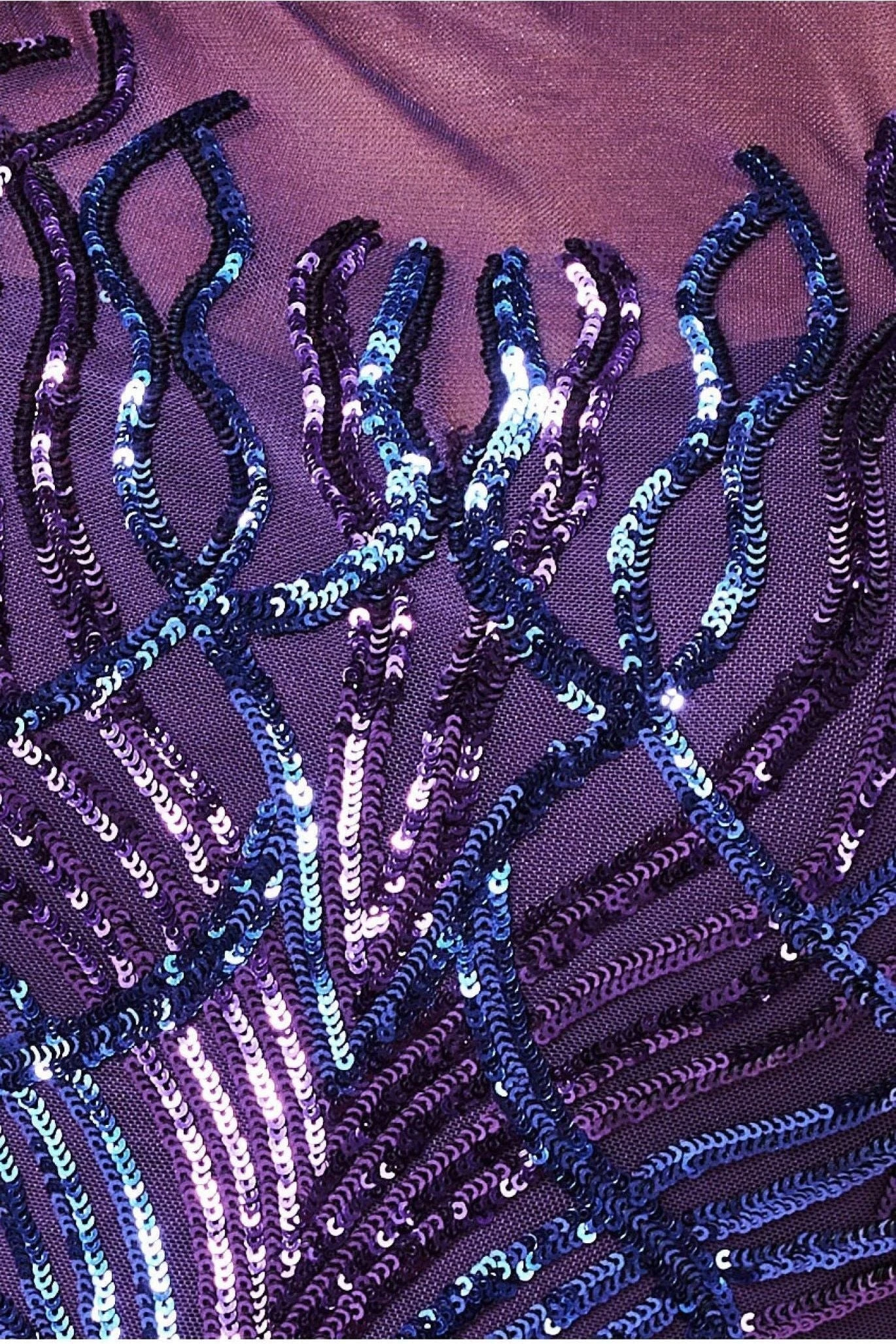 For that elegant black tie event, this aubergine long sleeve sequin maxi will be the perfect addition to your wardrobe. The Long Sleeve Sequin Flame Maxi is a gorgeous evening dress with an elegant and classy look. It features a sheer mesh round neckline and sheer long sleeves, which highlight the elegance of the wearer. The sequin detailing of this formal purple with navy detailing gown sparkles brilliantly in the light, adding a touch of glamour to your look. With its delicate mesh and sparkling sequin embellishment, designed in a flame pattern, this dress is the hottest dress of the season! This sparkling number is a must-buy for your upcoming events this season; whether it be for a black tie event, prom, wedding or formal party, this is the only gown you need.