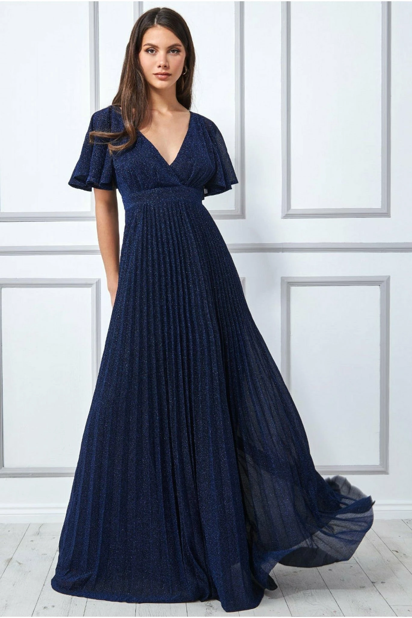 Give your evening occasion style an instant update with this flaunt-it maxi dress by Goddiva. This dress features a stunning glitter effect lurex material, perfect for any occasion as well as a wrap style, plunging v-neckline, flutter sleeves, short sleeves, open v-neck back and pleated skirt. The sleek design of this maxi dress is perfect for any occasion. The Lurex Pleated Maxi Dress is perfect pick for wedding guests, prom, bridesmaids and black tie events. In its stunning navy colour, this dress will never fail you. This versatile piece can be worn to any event – from evening parties to weddings. It’s chic, elegant, classy design teamed with its pleated fabric adds a touch of sophistication and style, perfect for all special occasions in any season.