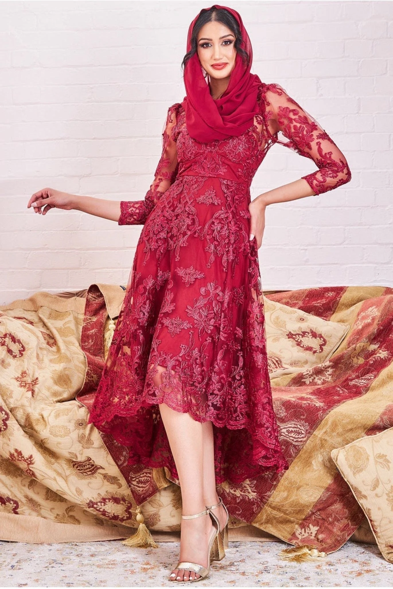 The perfect wedding guest dress that you’ve been searching for is here! This stunning scalloped lace dipped hem midi dress is a timeless piece that will take you from event to event in style. In its wine colour, this dress features a v-neckline, long sheer sleeves and back, scalloped detail on the neckline, long sleeves and dipped hem. This modest dress is a flattering fit for any woman, with its midi length and v-neckline that accentuates your figure, while the sheer sleeves and back add allure. This red dress is suitable for a range of events, including Asian weddings, Eid celebrations, and other special occasions. The delicate lace detailing adds a touch of elegance and femininity to the dress, making it a must-have for any modest fashion lover. Whether you’re going to a wedding or a date night, this gown will complete your look and take you places you’ve never been before. Pair it with the right shoes and accessories to make a lasting impression.