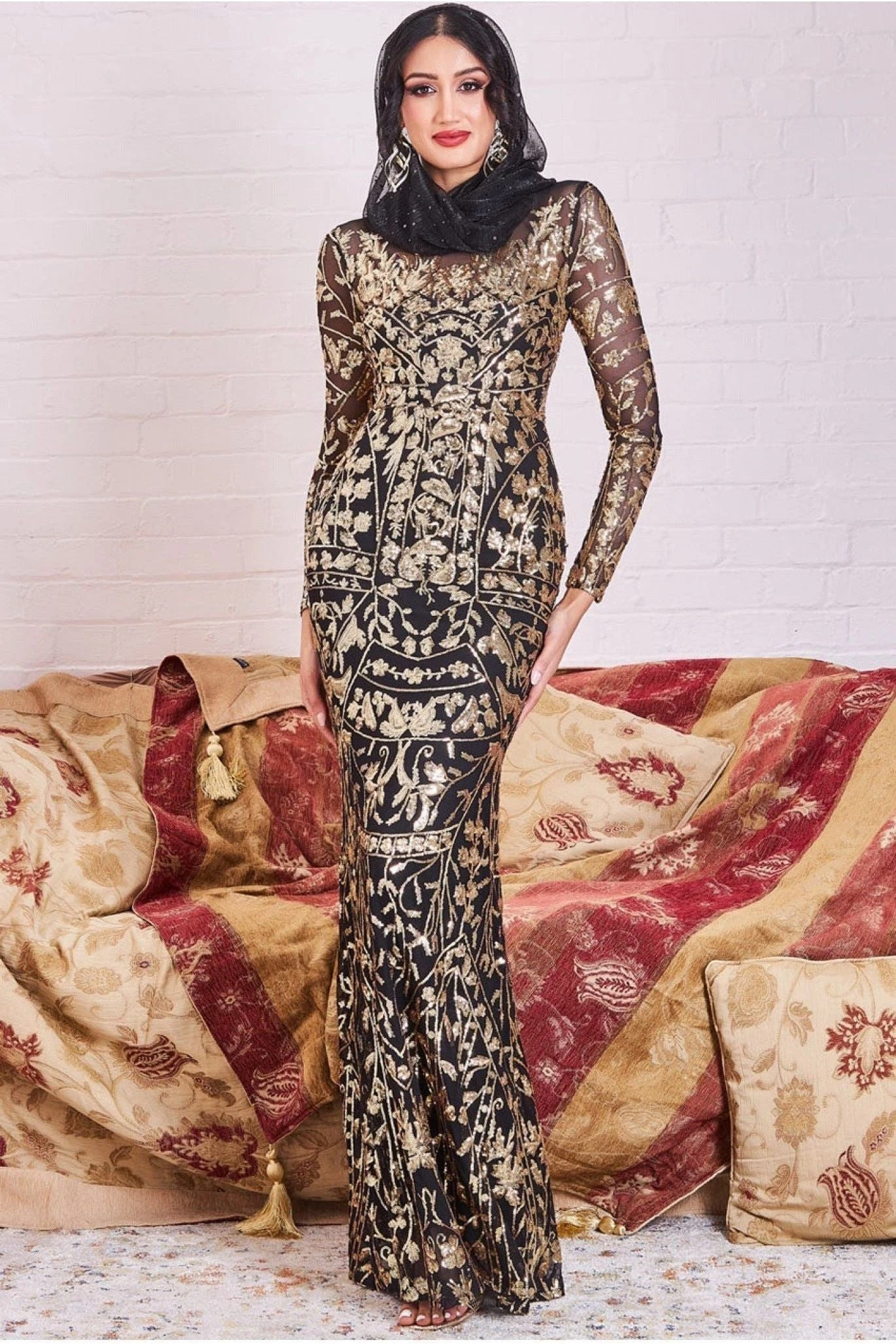 This stunning sequin mesh embroidered long sleeve maxi dress is a must-have for any woman looking to make a statement at her next special occasion. The elegant design features a round neckline and sequin detailing that will bring out your inner glamorous goddess! This sparkly floor length dark gold gown is perfect for evening occasions and can be worn to many different events, from weddings to formal gatherings. This modest fashion dress is a perfect choice for wedding guests, Eid celebrations, Asian weddings, prom and black tie events. The champagne colour is bound to be this season’s show stopper, and the all-over sequin embroidery adds just the right amount of sparkle to this modest evening dress. With its floor-length skirt, round neckline, and long sleeves, this dress offers a classic, elegant vibe that is perfect for any occasion.