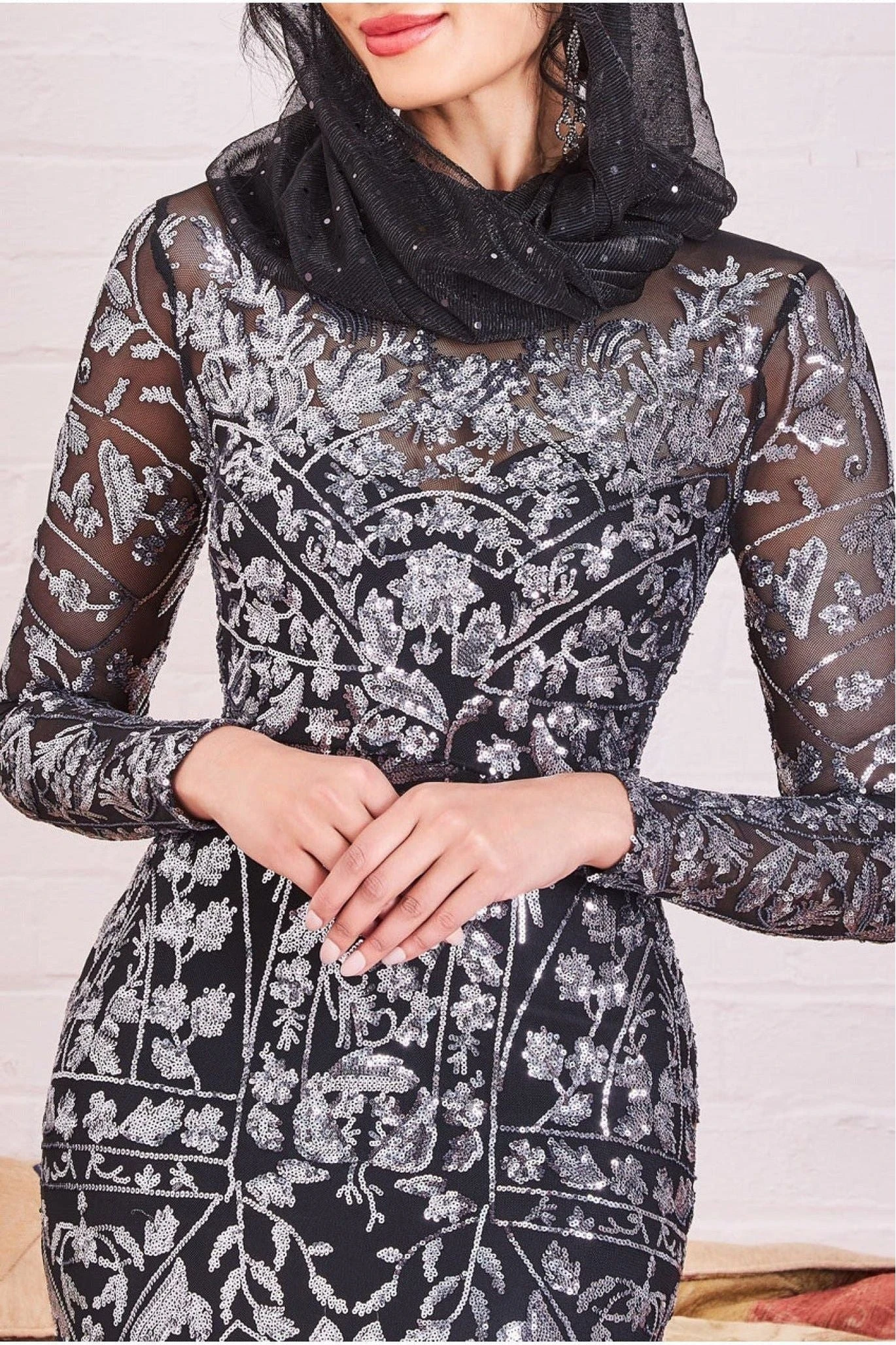 This stunning sequin mesh embroidered long sleeve maxi dress is a must-have for any woman looking to make a statement at her next special occasion. The elegant design features a round neckline and sequin detailing that will bring out your inner glamorous goddess! This sparkly floor length dark grey is perfect for evening occasions and can be worn to many different events, from weddings to formal gatherings. This modest fashion dress is a perfect choice for wedding guests, Eid celebrations, Asian weddings, prom and black tie events. The silver colour is bound to be this season’s show stopper, and the all-over sequin embroidery adds just the right amount of sparkle to this modest evening dress. With its floor-length skirt, round neckline, and long sleeves, this dress offers a classic, elegant vibe that is perfect for any occasion.