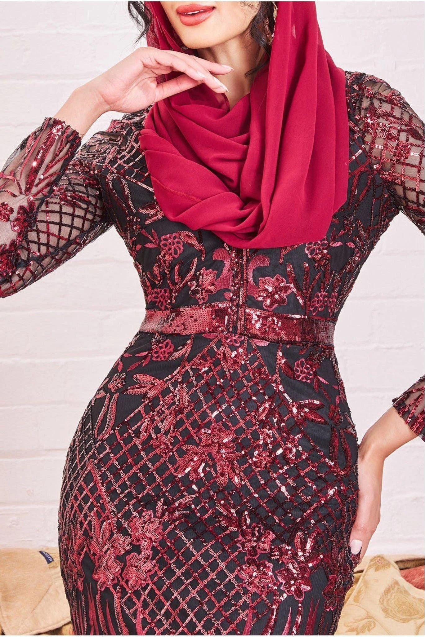 Our stunning long sleeve v-neck sequin maxi dress, perfect for special occasions and evening events. This wine occasion dress combines elegance and modest fashion, featuring a flattering v-neckline and long sleeves for a sophisticated look. The dress is embellished with beautiful sequins that catch the light and add a touch of glamour. This modest red evening dress is suitable for a range of events, including Asian weddings, Eid celebrations, and other special occasions. Don’t miss out on this exquisite piece that will make you stand out from the crowd.