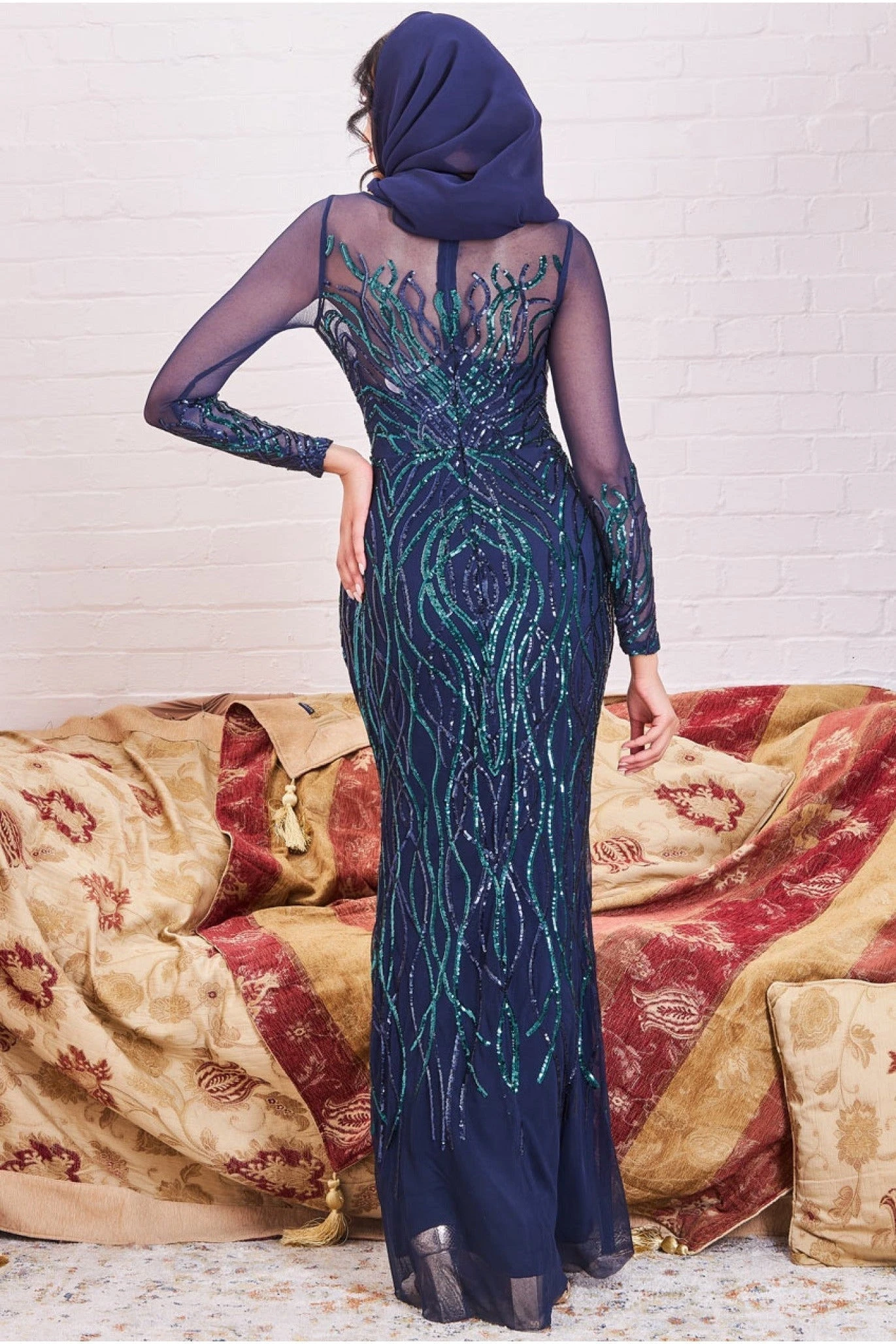 Looking for the perfect evening dress or occasion dress for that elegant black tie event? Look no further than the long sleeve sequin flame maxi! This stunning blue gown is the winning pick for you this season. With its sheer mesh round neckline and long sleeves, this dress is elegant and classy, highlighting the beauty of the wearer. The sequin detailing on the gown sparkles brilliantly in the light, adding a touch of glamour to your look. The delicate mesh and sparkling sequin embellishment, designed in a flame pattern, make this dress the ‘hottest’ dress of the season! This modest dress is perfect for those who are interested in modest fashion. It is an ideal choice for Asian weddings, Eid celebrations, and other special occasions. This sparkling number is a must-buy for your upcoming events this season; whether it be for a black tie event, prom, wedding or formal party, this is the only gown you need. This navy long sleeve sequin flame maxi is the perfect addition to your wardrobe if you’re looking for an evening dress that is both elegant and glamorous.