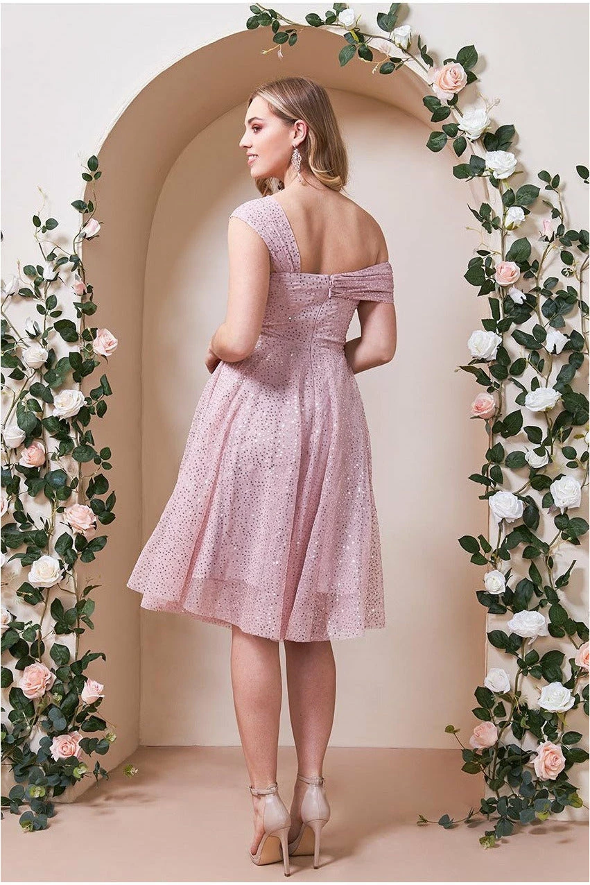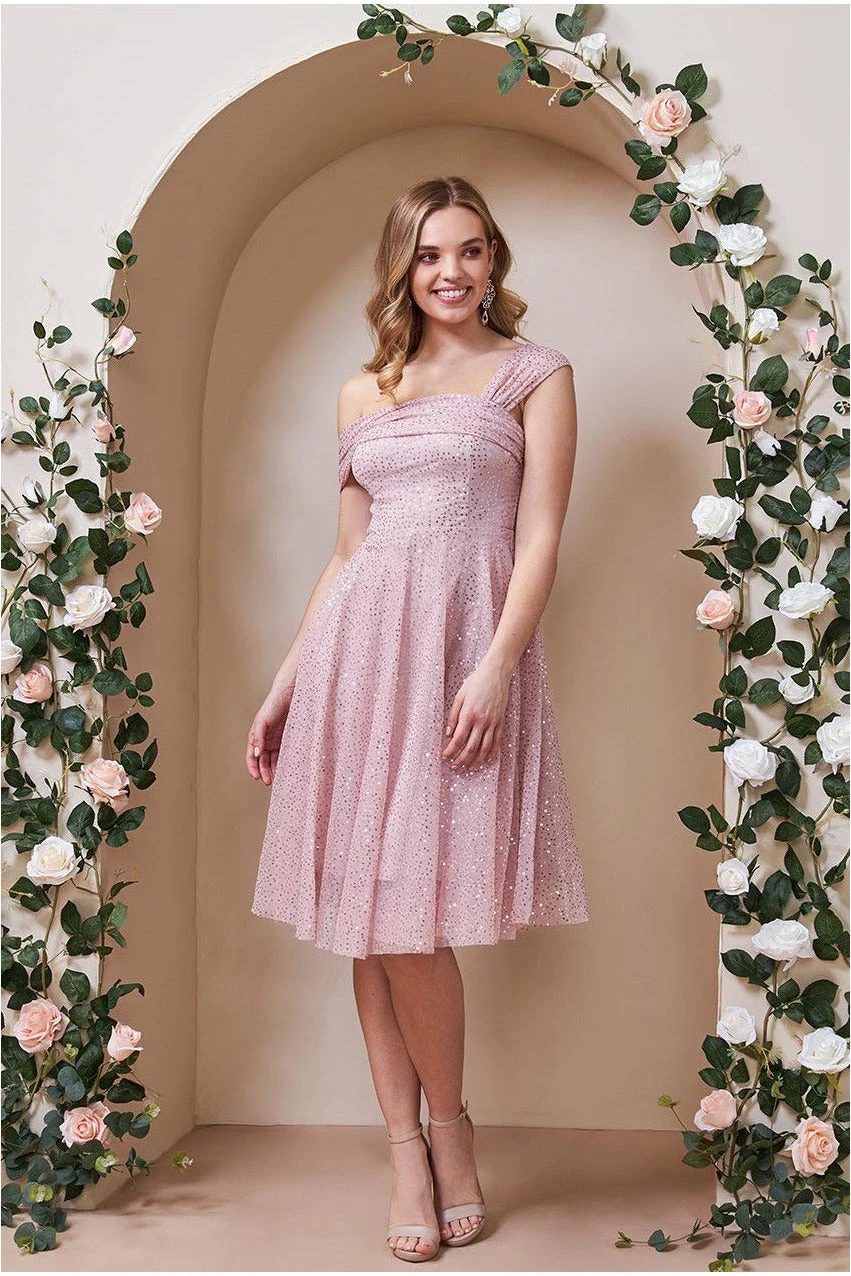 The midi dress of the century is finally here and looks better than you could ever imagine. This sparkly blush short dress is the perfect dress for all summer fun. A obvious best seller for bridesmaids, prom and wedding guests this season. Its one shoulder style with square neckline adds a touch of fabulousness to this darling style. This fairy-tale like shimmery dress is a top pick for summer events, including the races. In its magically charming pink colour, this style will be your first pick for all occasions, whether it’s a birthday, family gathering, christening or special dinner, this date night dress is perfect for everything.