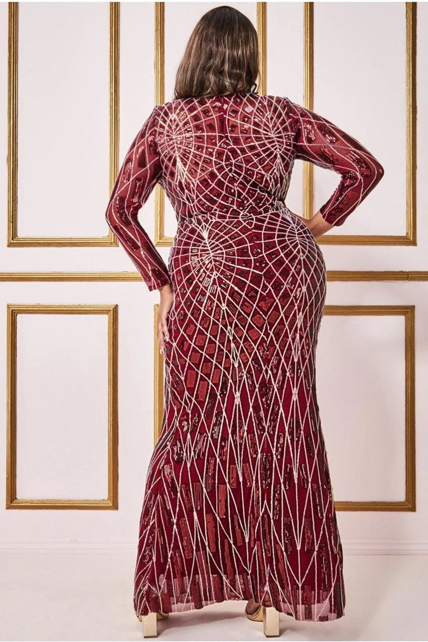Featuring sheer long sleeves with a plunging V-neckline and an open back, this curvy maxi dress with geometric sequins is sure to be the perfect way to spark up your look. The sequins are intricately woven into a beautiful design that make the dress shimmer and shine under the lights. This long sleeve plus size wine maxi dress is a must-have in your wardrobe this season. Featuring an iridescent sequin pattern, plunging V-neckline and sheer long sleeves, it’s perfect for those black tie occasions or when you want to make a statement. Step out in style for every occasion this season with this delicious dark red number. Style yours with heels and clutch bag for a glamorous look that will leave everyone spellbound.