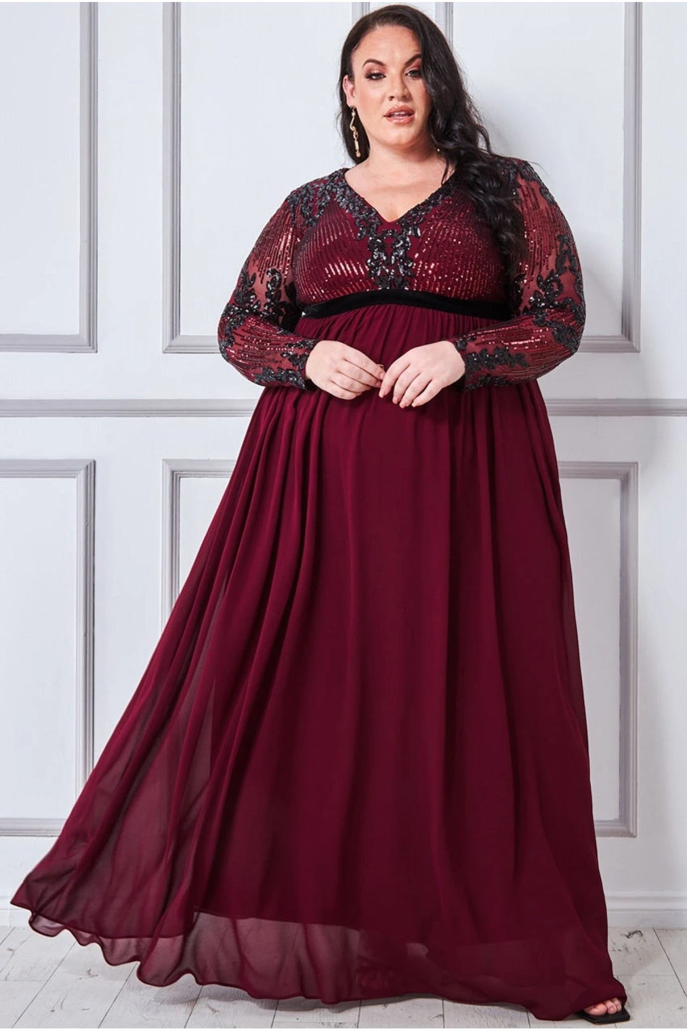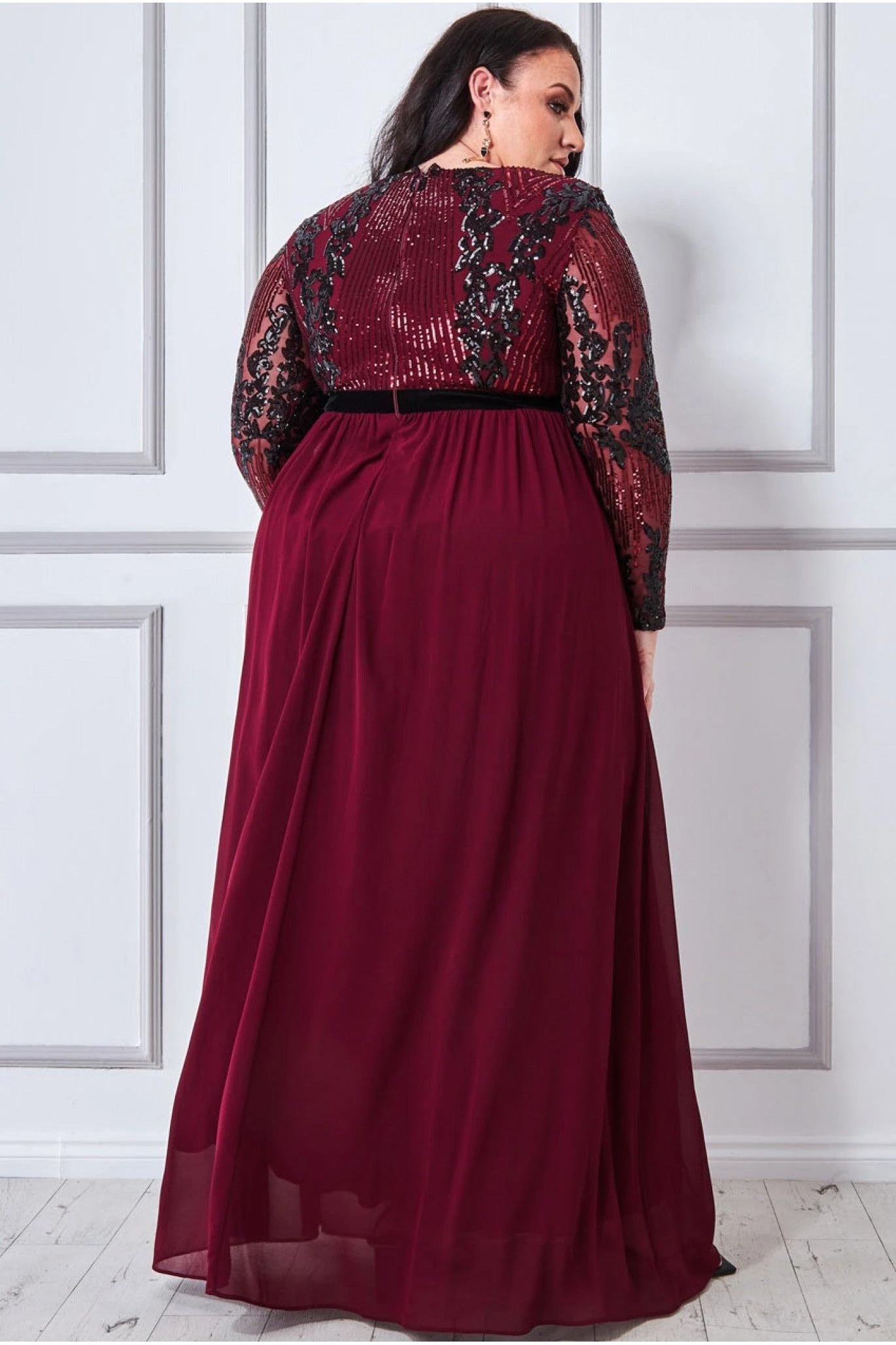 The Goddiva sequin and mesh bodice maxi dress with chiffon skirt is a must-have for the party season. Featuring a sequin and mesh bodice with plunging neckline, this stunning fuller figure flattering dress has bridesmaids written all over it. In its classic wine & black coloured sequin top teamed with its all black floor length chiffon skirt makes this curvy number a top pick not only for bridesmaids, but also for prom, black-tie events, christmas parties and of course the mother of the bride (or groom). This dark red maxi dress is a one of a kind dress for the woman with the fuller figure. The sequin and mesh bodice is paired with a beautiful chiffon skirt that will have you looking and feeling glamorous all night long. This sparkling plus size number will have you twirling round all night showing off that floaty princess skirt.