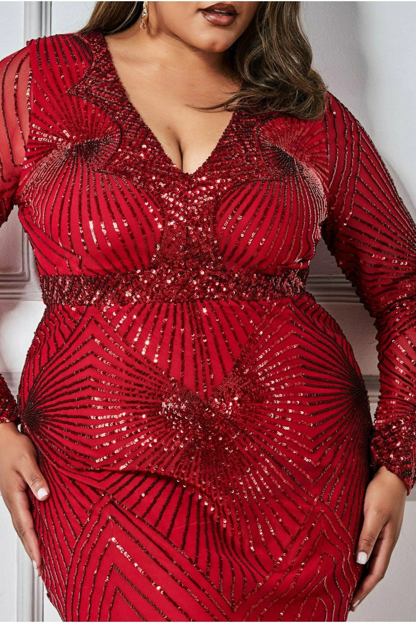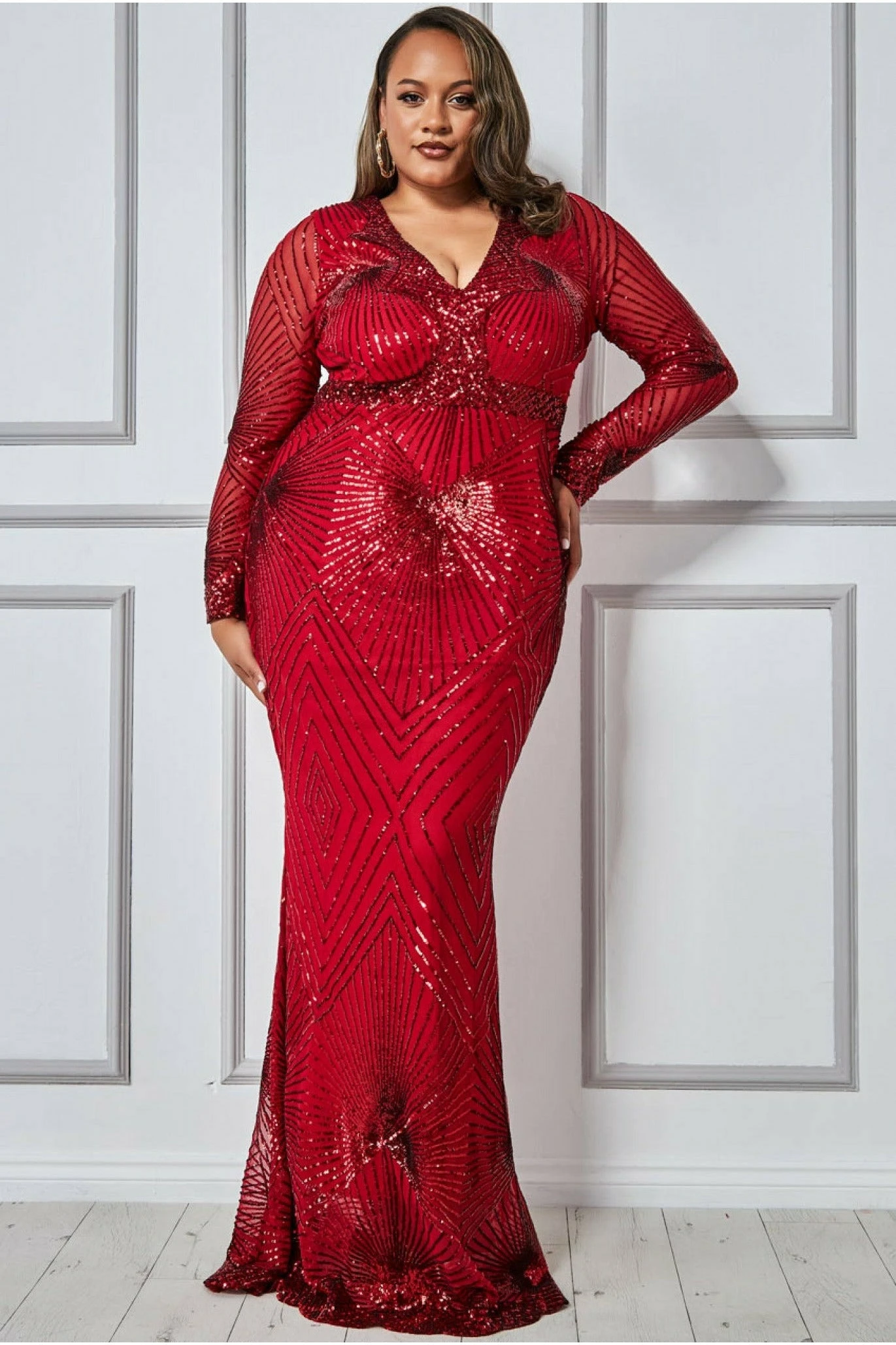 Leave a little sparkle wherever you go in this dramatic red starburst sequin maxi dress from the Goddiva Plus collection. This unique twist on a simple maxi plus size dress is impressively stunning. The all over sequins splashed in a starburst effect gives this curvy dark red long dress an artistic feel. Its flirtatious plunge v neck, classic long sheer sleeves and its exquisite fishtail hem gives it that extra touch of elegance. This timeless red  maxi dress, for a fuller figure, is the ultimate dress for any occasion all year round. Be ready for all events when you have this dress in your life, whether it’s a wedding, evening party, formal occasion or even prom, this piece is graceful as it sounds.