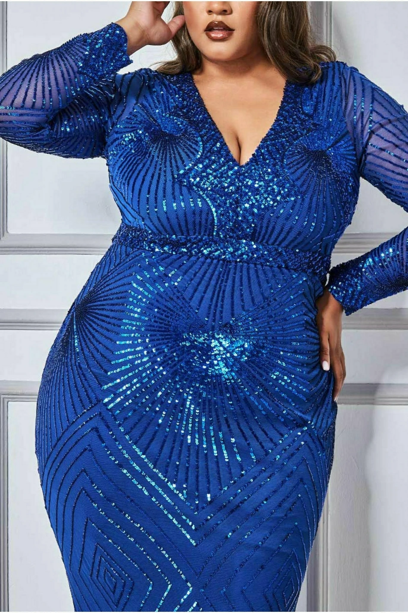 Leave a little sparkle wherever you go in this dramatic royal blue starburst sequin maxi dress from the Goddiva Plus collection. This unique twist on a simple maxi plus size dress is impressively stunning. The all over sequins splashed in a starburst effect gives this curvy dark blue long dress an artistic feel. Its flirtatious plunge v neck, classic long sheer sleeves and its exquisite fishtail hem gives it that extra touch of elegance. This timeless blue maxi dress, for a fuller figure, is the ultimate dress for any occasion all year round. Be ready for all events when you have this dress in your life, whether it’s a wedding, evening party, formal occasion or even prom, this piece is graceful as it sounds.