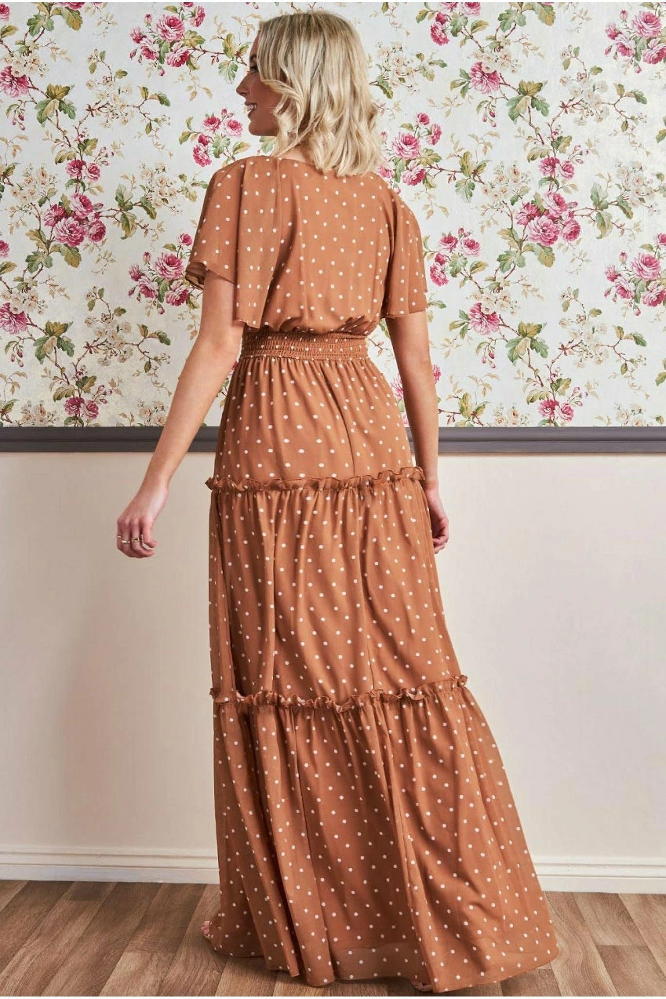 This season’s must have maxi is brought to you by Goddiva. This trending style features lightweight chiffon fabric, a wrap style v-neck, short frill sleeves, an elasticated shirred waistband and a tiered floor length skirt. In its brown this long dress is a perfect spring and summer outfit for any special occasion. It can be worn for a romantic date, brunch with friends or as an elegant look for your next wedding. The light weight fabric and luxurious chiffon makes this dress feel so soft on the skin and move gracefully around the body. Polka dots are a classic pattern, they never go out of style and their appeal never wanes making this long brown dress a great addition to your summer wardrobe.