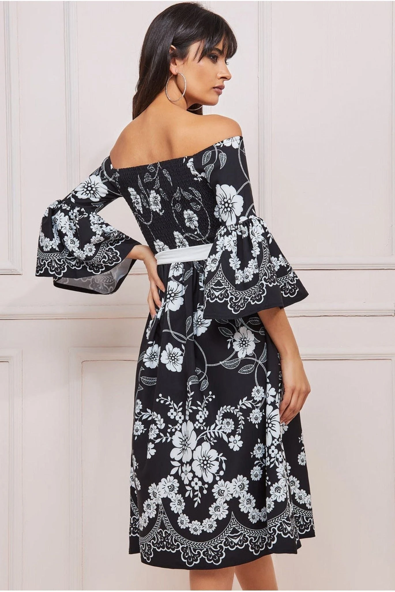 Look hot and feel cool with this printed off the shoulder midi. The perfect balance of contemporary and classic, this black midi dress is sure to make a statement at your next event. It features a fun floral print, off the shoulder detail and an A-line shape that makes it the perfect addition to your wardrobe this season! The off the shoulder style teamed with its three quarter bell sleeves and skater style skirt and floral embroidery bring a romantic and stylish vibe to this stunning black dress. Summer will never be over once you have this gorgeous number in your closet. Pair it with your favourite sandals and accessories for the ultimate look.