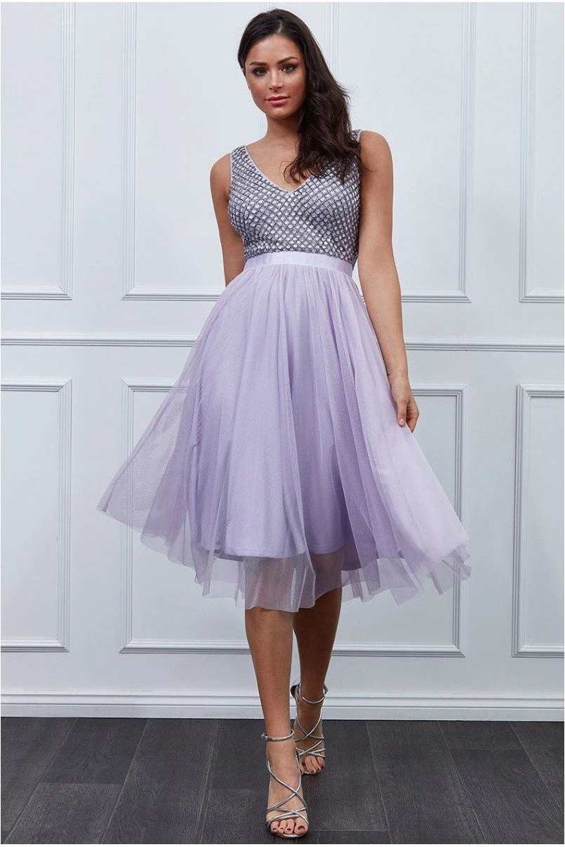 Feel magical in this charming sequin bodice pleated midi dress by Goddiva. This sensational purple short dress is beautifully designed so it can be worn for many occasions, the opportunities you’ll have to wear this fairy-tale inspired number are limitless. Its sleeveless style, sequined bodice, and pleated mesh skirt give this glamorous dress the green light to be worn for bridesmaids, birthday celebrations, graduations, proms, wedding guests,s and any other evening event you can think of. In its fabulous lavender color, this sparkling midi dress is a winner all year round. This dreamy occasion dress will have you feeling like a princess. It’s below the knee length, brings a classy elegant, yet fun and flirty side to this gorgeous midi dress. Choosing a dress for an occasion or for your bridesmaids has never been so easy.