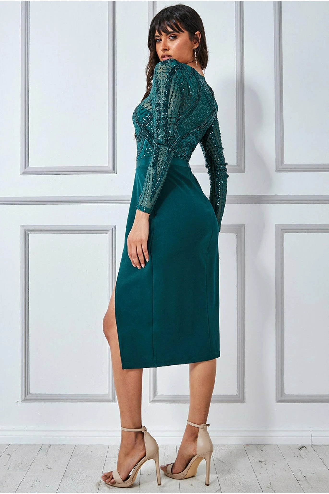 This Sequin Bodice with Front Frill Midi dress, is a gorgeous and fun evening party dress that will make you stand out and feel confident in any social situation. This date night worthy bodycon number is that dress that showcases your curves and leaves you feeling confident from the moment you split it on. A perfect pick for wedding guests, date nights, cocktails with friends, nights out on the town and other formal or semi formal events. In its classic wonderful emerald colour, this short occasion dress is ticking all the boxes. With its kong sleeves, round neckline, sequin & mesh bodice teamed with a scuba crepe skirt and fun front frill, this dress is the winter warmer you need.Â