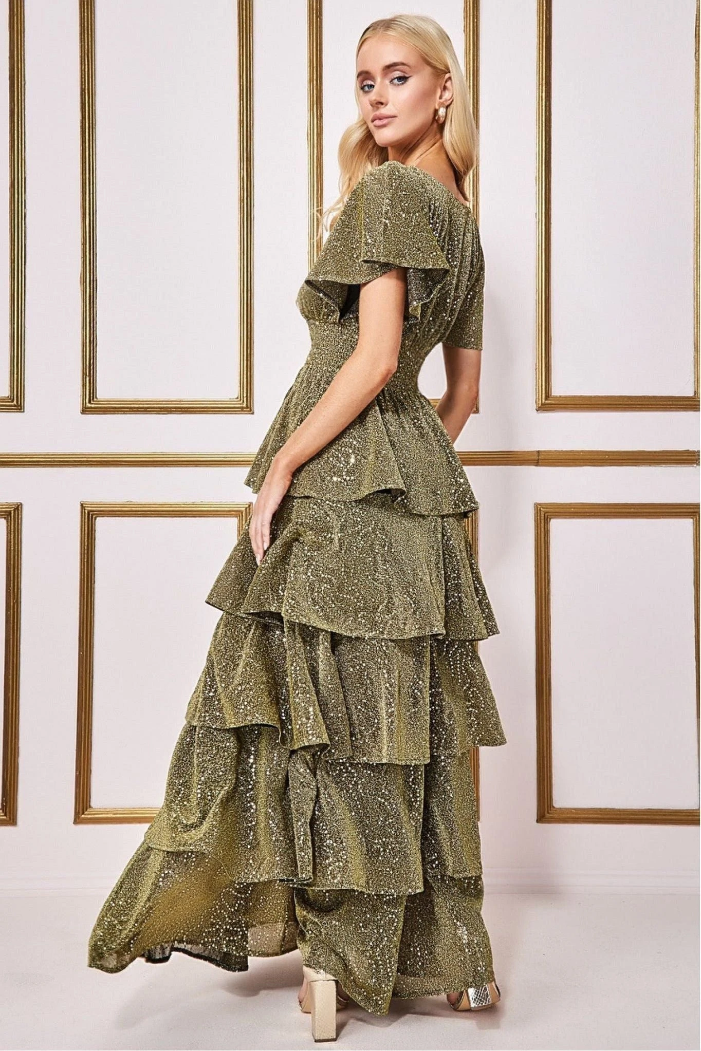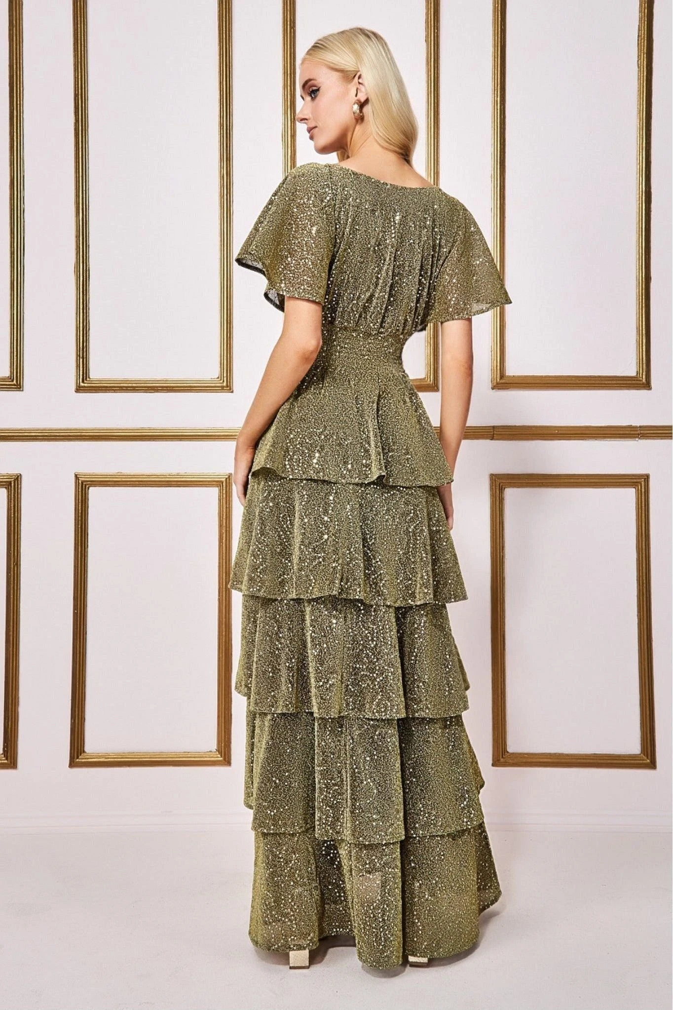 The Goddiva Sequin Lurex Tiered Maxi Dress is a lovely dress for so many occasions. It can be worn to a semi-formal event or as a wedding guest dress. This long gold maxi dress features multiple layers of sequin and glitter fabric that cascades down the body in tiered waves. This semi-formal long dress is a dream for every lady in this world. The elegant flutter sleeves will make the look more exquisite. This gold dress has a detachable belt on the waist to highlight your best feature! A perfect pick for all occasions this season, from christmas dinner, to new years family gatherings, birthdays to christenings, this whimsical number is here to fulfil your every need.