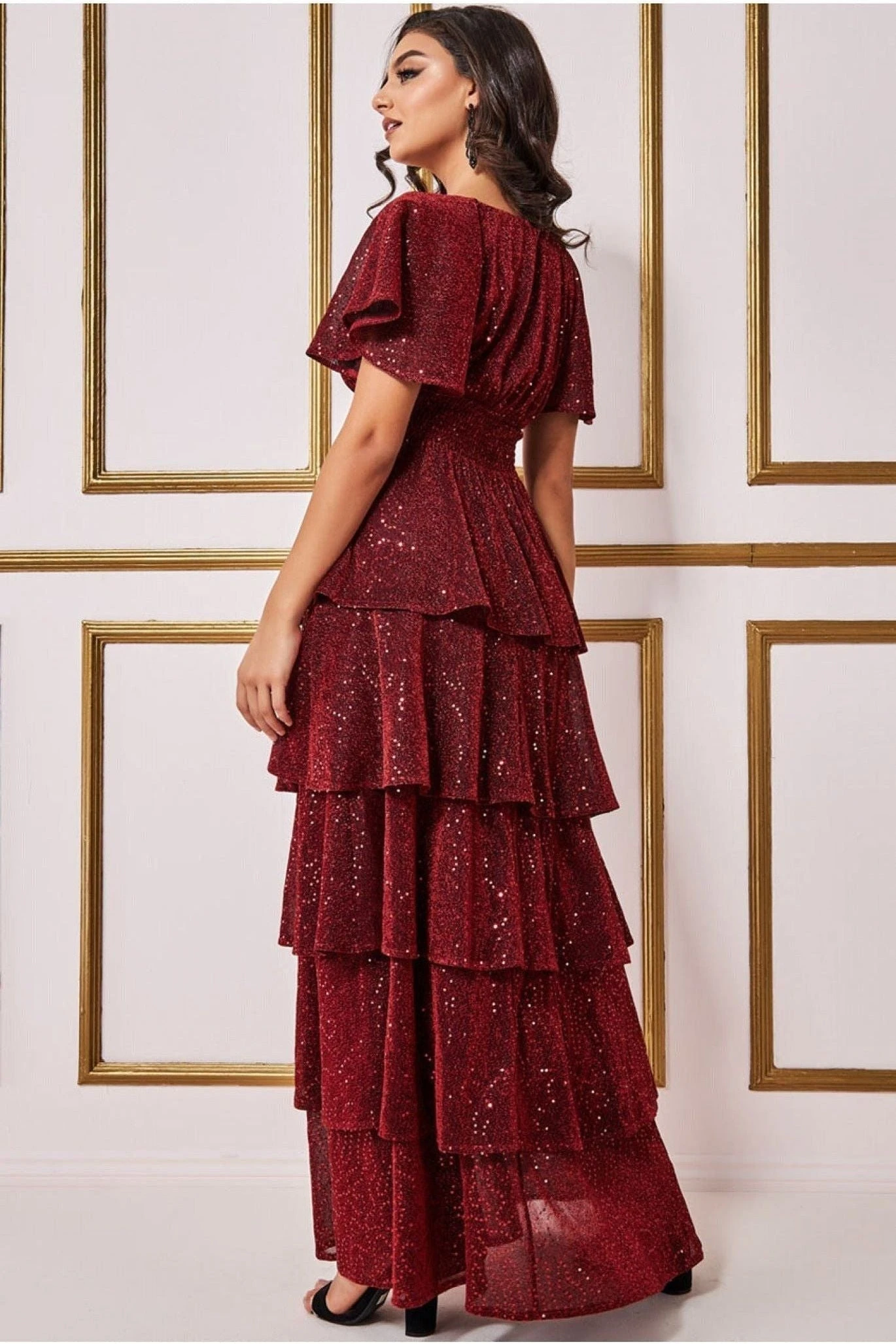 The Goddiva Sequin Lurex Tiered Maxi Dress is a lovely dress for so many occasions. It can be worn to a semi-formal event or as a wedding guest dress. This long wine maxi dress features multiple layers of sequin and glitter fabric that cascades down the body in tiered waves. This semi-formal long dress is a dream for every lady in this world. The elegant flutter sleeves will make the look more exquisite. This dark red dress has a detachable belt on the waist to highlight your best feature! A perfect pick for all occasions this season, from christmas dinner, to new years family gatherings, birthdays to christenings, this whimsical number is here to fulfil your every need.