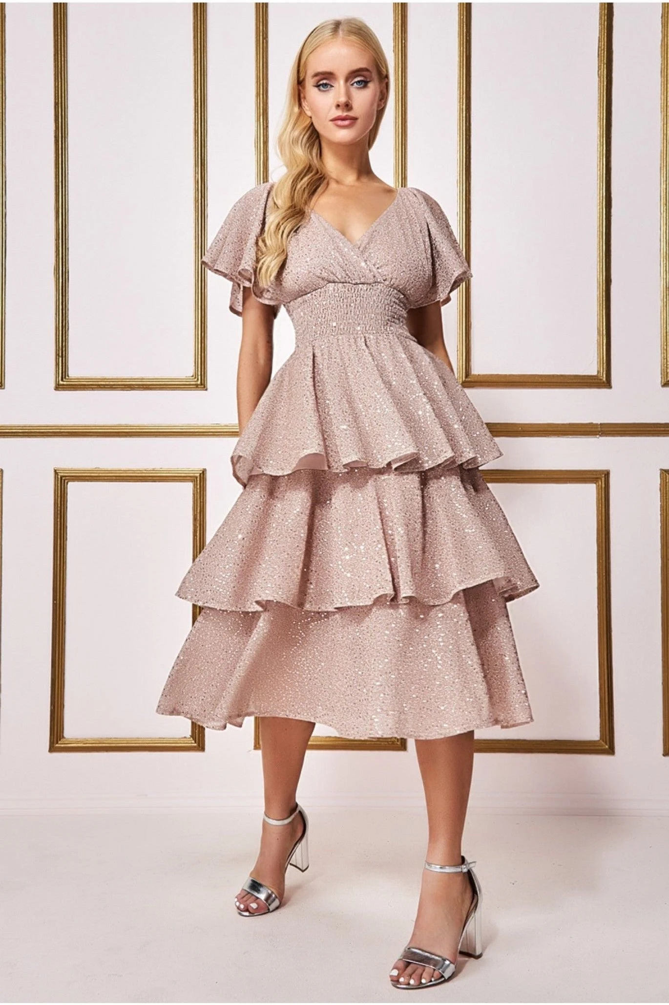 Be the first to review “Goddiva Sequin Lurex Tiered Midi Dress – Champagne” Cancel reply