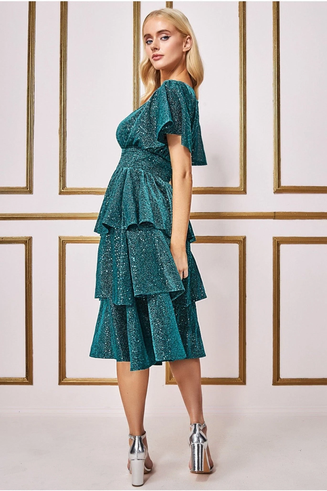 Be the first to review “Goddiva Sequin Lurex Tiered Midi Dress – Teal Blue” Cancel reply