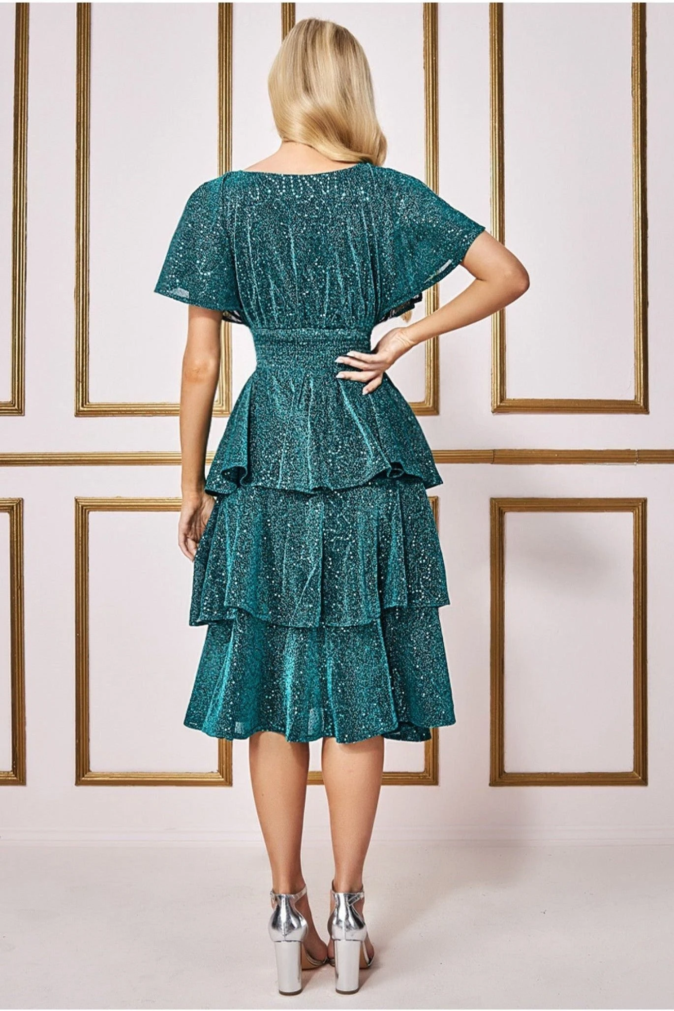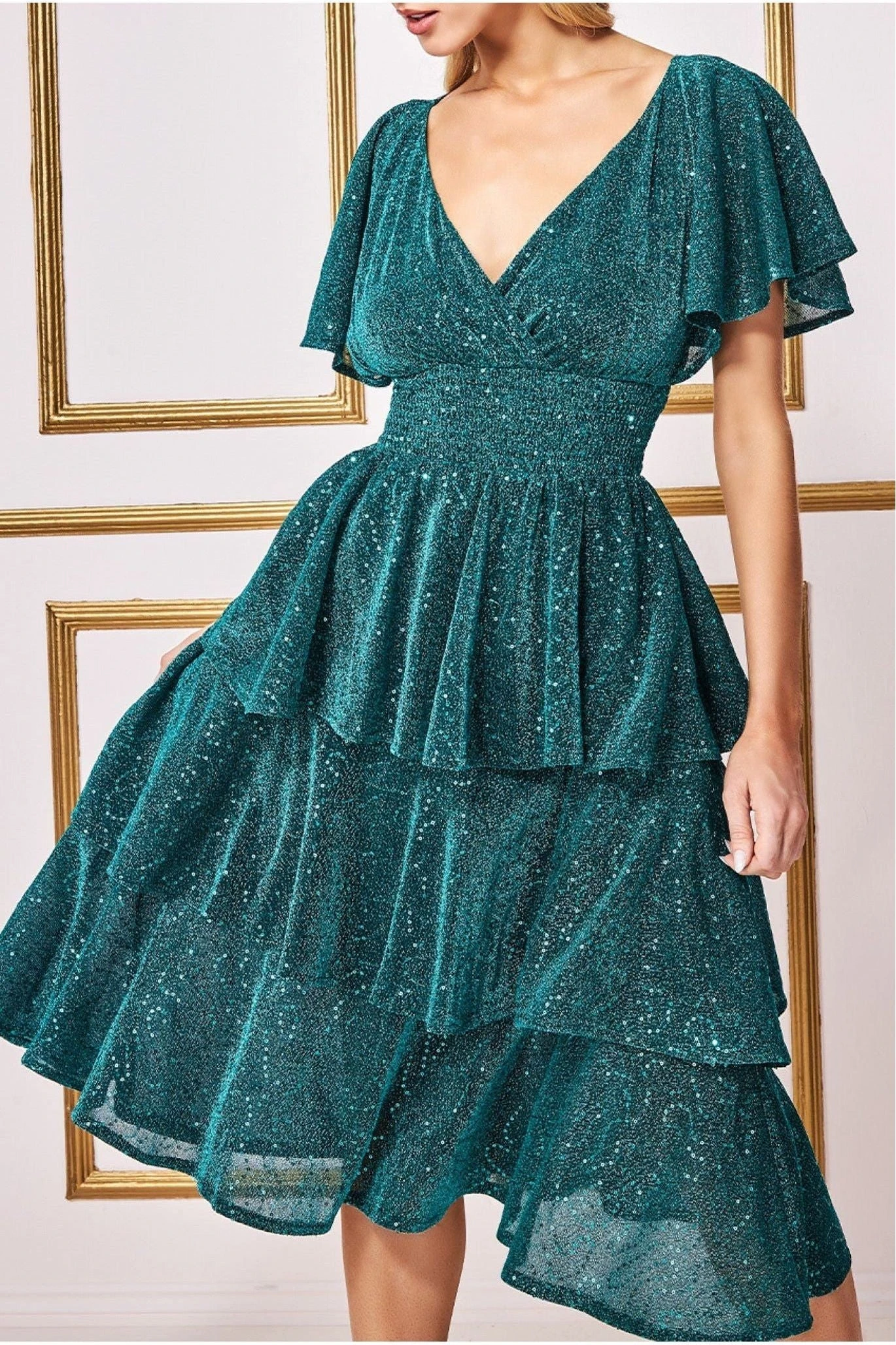 A gorgeous mix of shimmering metallics and layering come together to spell out a very sophisticated look. This flowing, sparkling teal dress is the perfect garment to make your entrance at a special event or any occasion as glamorous as can be. A must have piece for your wardrobe this season. This wrap style v-neck dress features a sequin lurex woven midi skirt with a tiered effect and flutter sleeves. Wear statement heels to complete the look and stand out at any occasion this season! This blue dress is a winning pick for birthday parties, dinners with friends, date nights, wedding guests and cocktails with the girls, making it a well-rounded option to have in your closet. Teamed with the right shoes, bag and accessories, this layered short dress will take you to places you have never dreamed of going before!