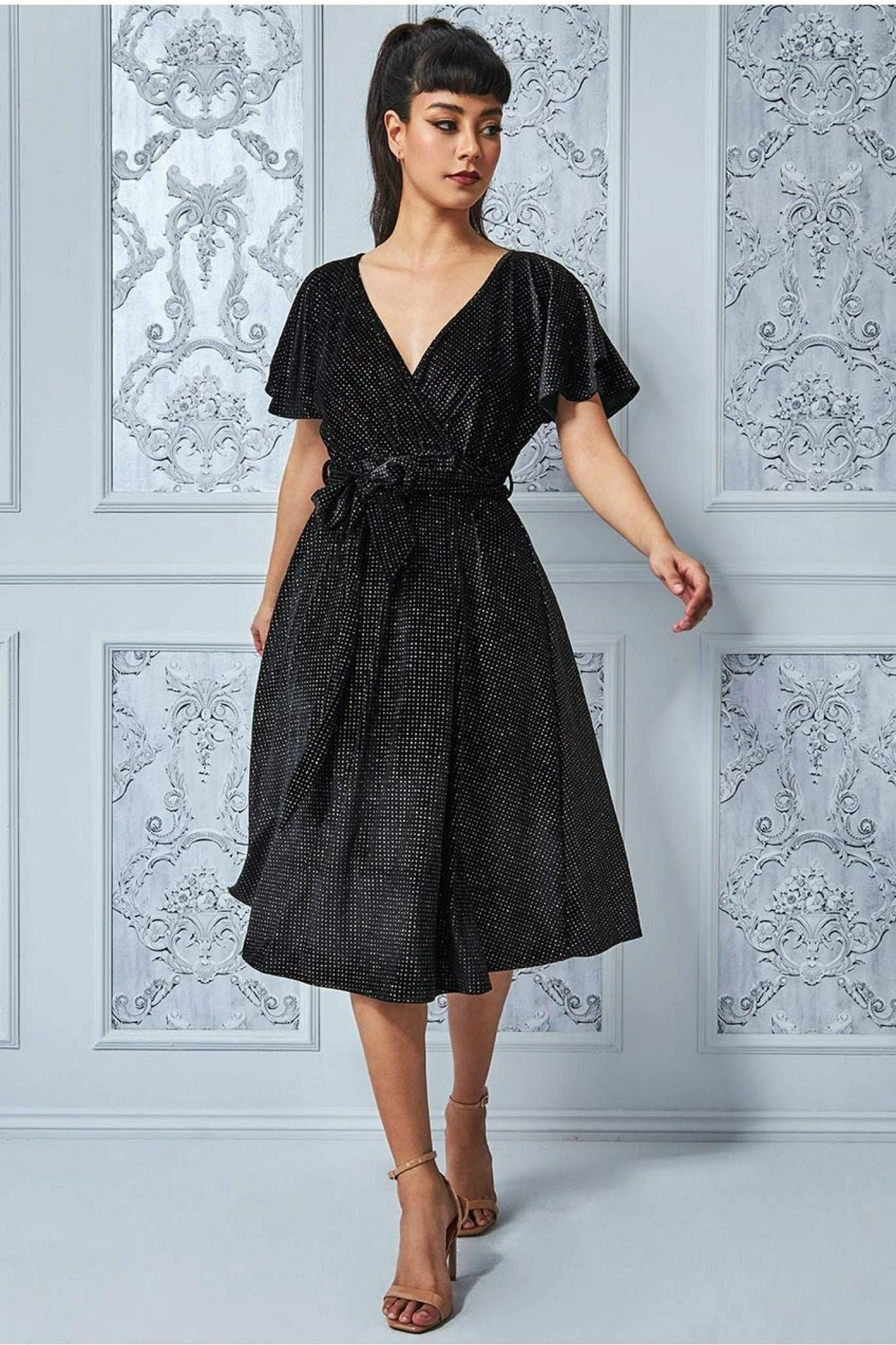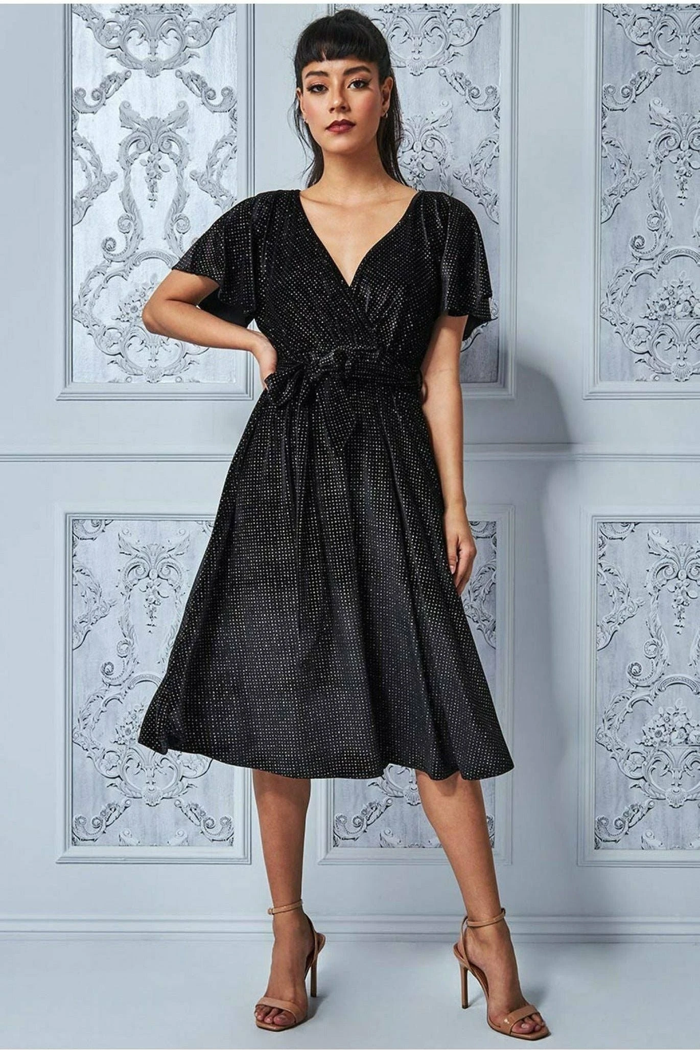 Feel like a goddess with this black sparkle wrap style flutter sleeve midi dress. This gorgeous diamante embellished dress features flutter sleeves, tie waist and trending wrap style v-neckline. This midi style dress is the perfect addition to your wardrobe. The sequin detailing adds a bit of sparkle that will make you stand out for any occasion, whether it be as a wedding guest, dinner date, cocktails with friends or for a christmas party or casual NYE gathering, teamed with heels and a clutch for an elegant evening look. This midi dress has a comfortable fit and is sure to be a favorite. With its shimmering material, this lbd will have you shining like the diamond you are. The skirt flares out ever so slightly to create a beautiful shape.