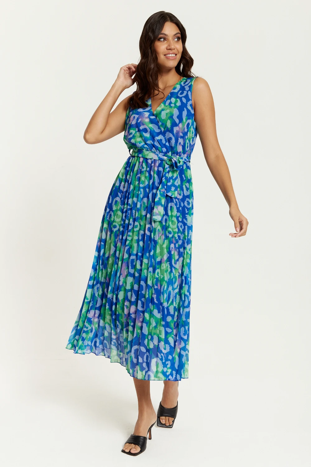 The perfect party dress for this season. Wrap Front Multi Coloured Leopard Print Maxi Dress with Pleat Details in Blue will create the perfect impression to your look.