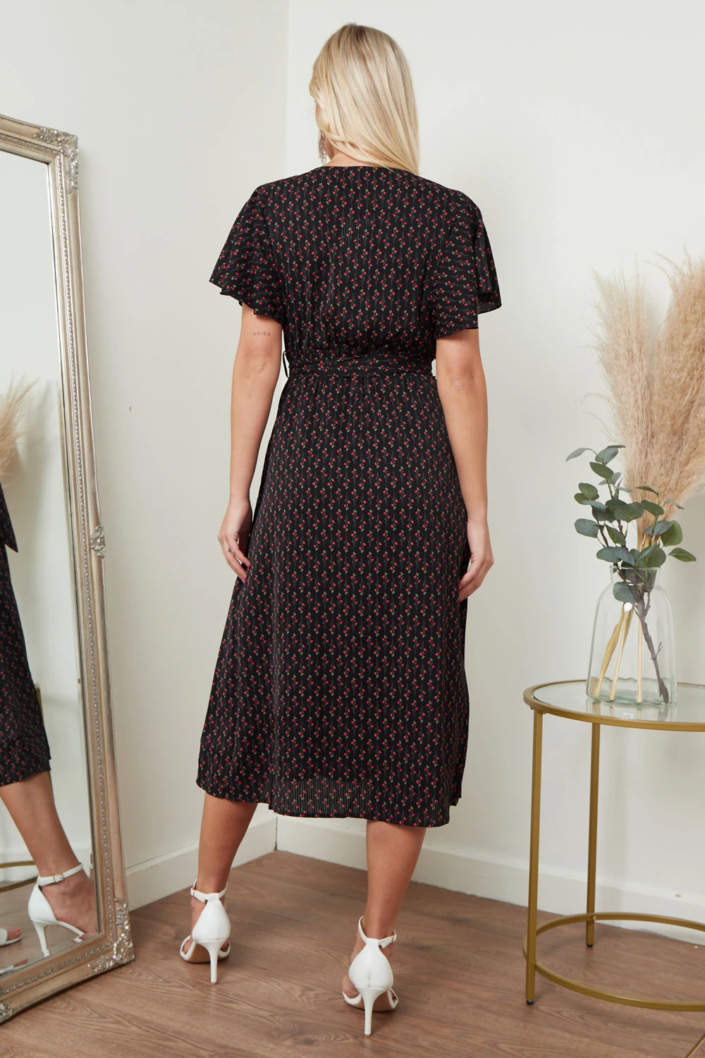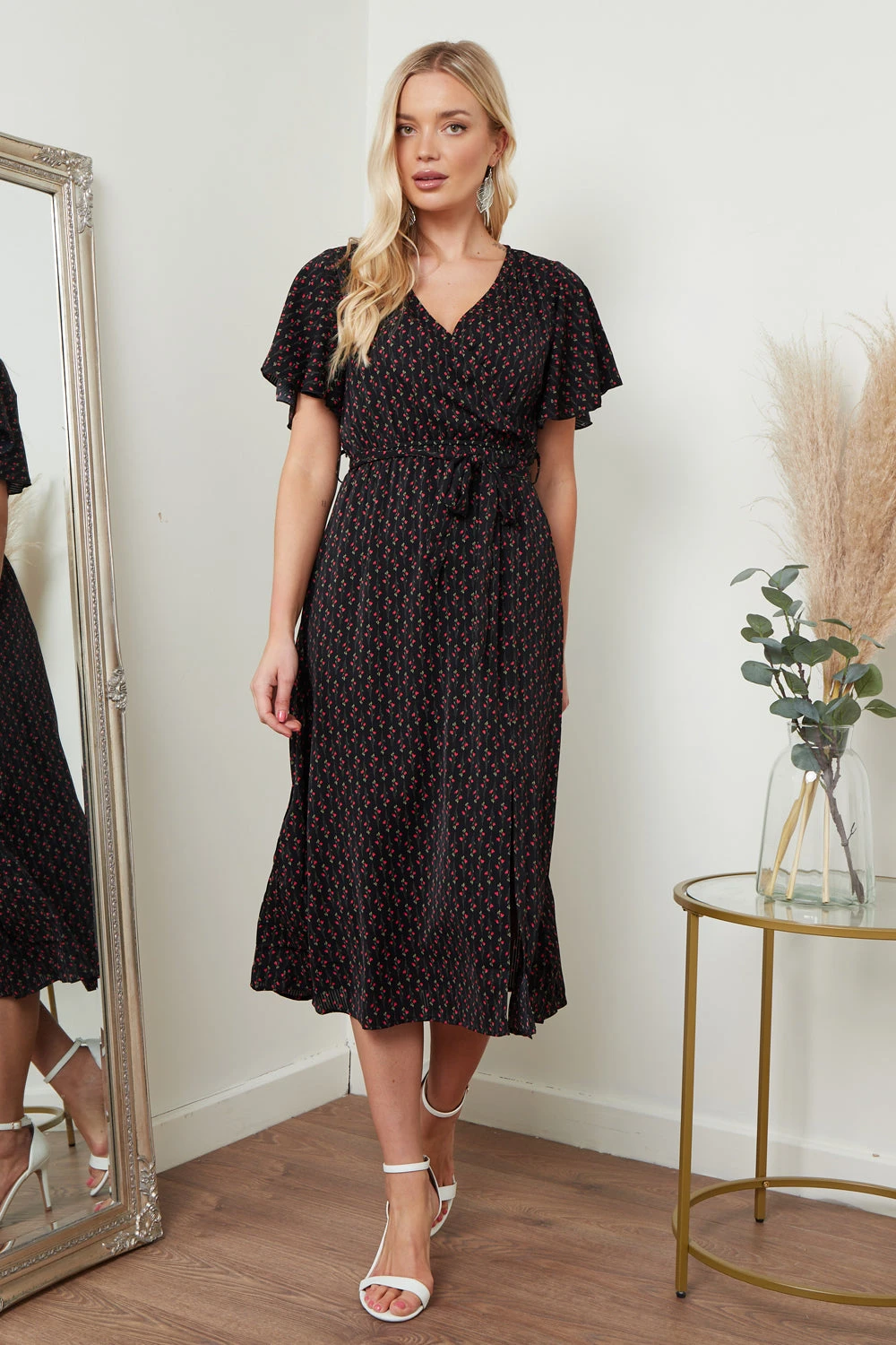 Introducing the stunning Angel Sleeves Midi Wrap Dress In Black Floral Print – the perfect choice for your next special occasion. This dress features a flattering v-neckline and elegant angel sleeves that add a touch of sophistication to your outfit. The stylish side split adds a hint of glamour to this beautiful dress, making it a statement piece that will turn heads. Crafted from high-quality materials, this dress is not only stylish but also comfortable to wear. The elasticated waistband ensures a perfect fit for any body shape, making it a versatile option for any event. The beautiful black floral print adds a touch of elegance to this stunning dress, making it the perfect choice for any occasion. Whether you’re attending a wedding or heading out for a night on the town, this dress is the perfect choice. Pair it with blush heels and a matching mini bag for a chic, sophisticated look that’s sure to impress.