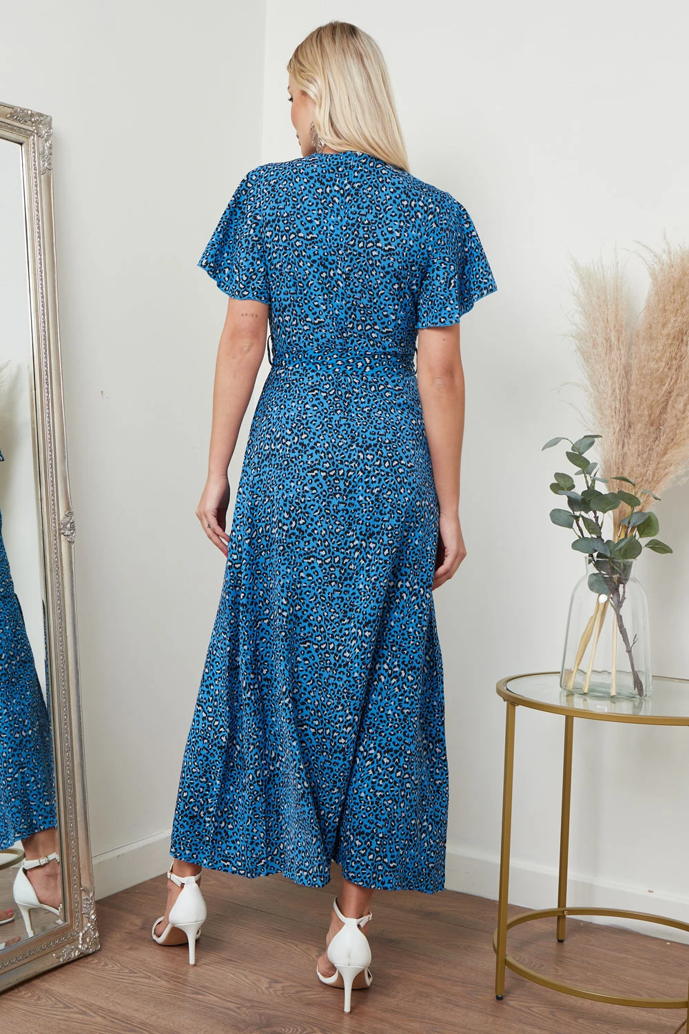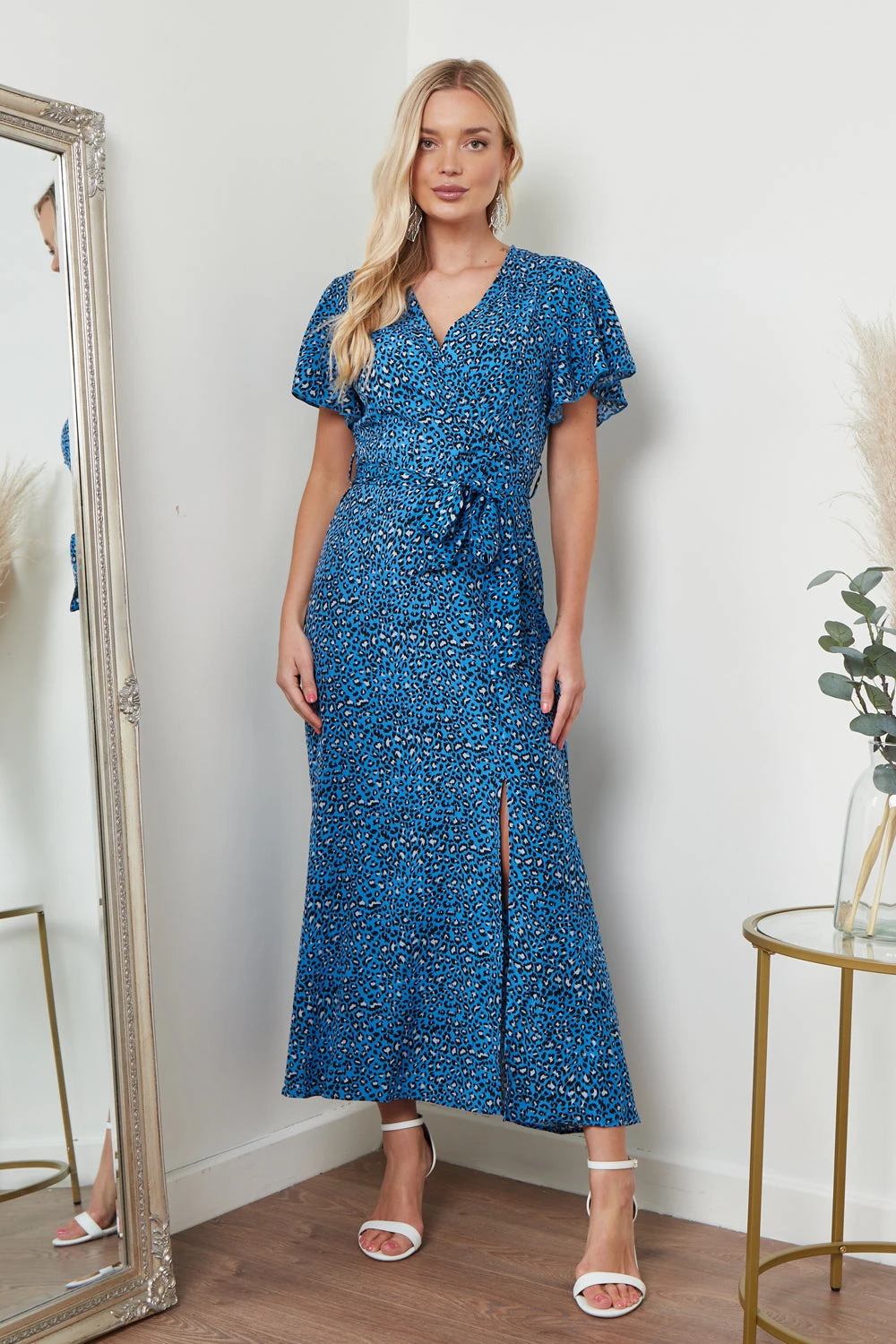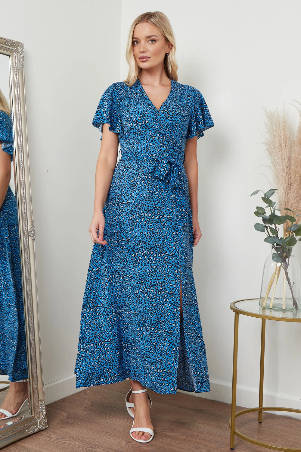 Looking for a dress that combines elegance, playfulness, and versatility? Look no further than our Wrap Front Maxi Dress in Blue Animal Print. With its stunning blue animal print fabric and flattering wrap design, this dress is sure to make a statement wherever you go. The plunging neckline adds a touch of femininity and elegance, while the tie waist detail cinches in at the waist to highlight your curves. The leg split detail adds a playful touch and allows for ease of movement, making this dress perfect for any occasion. This dress can be styled in a variety of ways, making it a must-have addition to your wardrobe. Dress it down with some strappy sandals and a mini bag for a casual daytime look, or dress it up with some heels and statement jewellery for a night out on the town. The possibilities are endless.