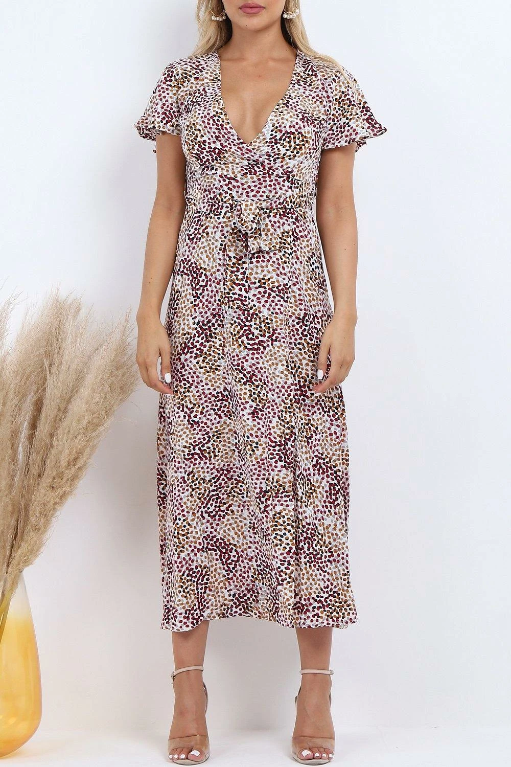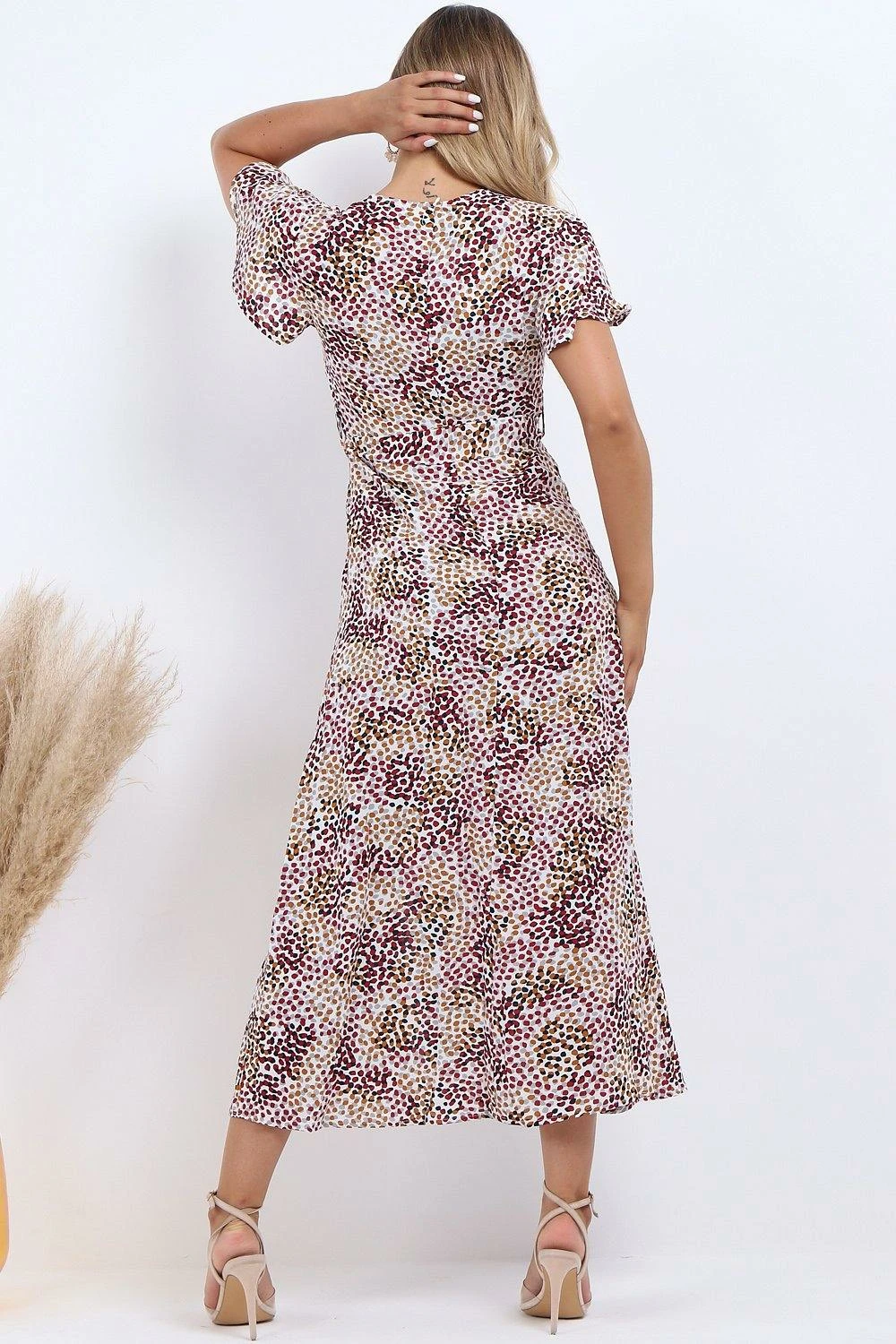 Update your summer-worthy wardrobe with this maxi dress. Featuring a white multi spot print fabric with a wrap design, plunge neckline, a tie waist and a leg split detail. Team with some strappy heels and a mini bag for day drinks with the girls.