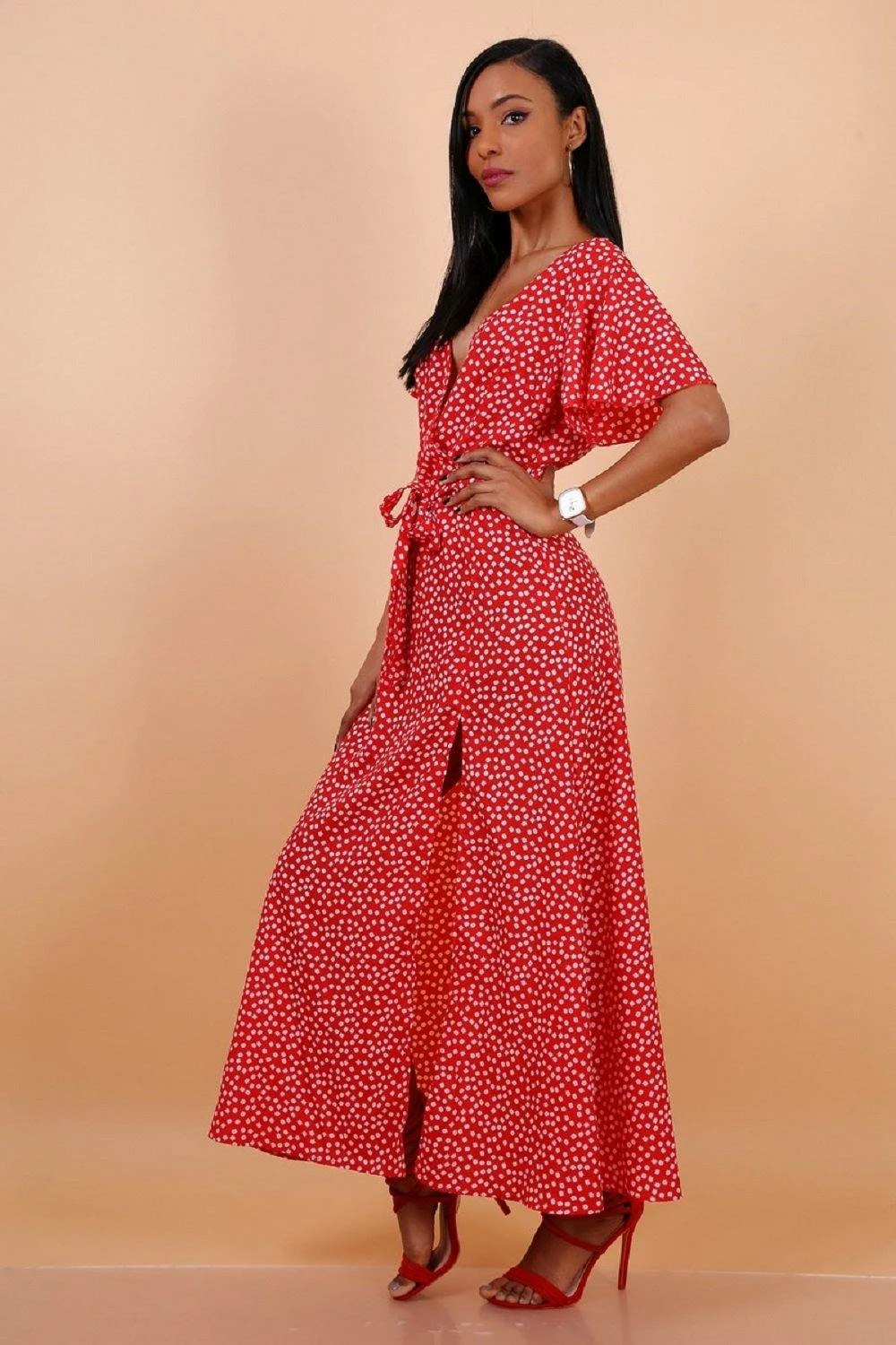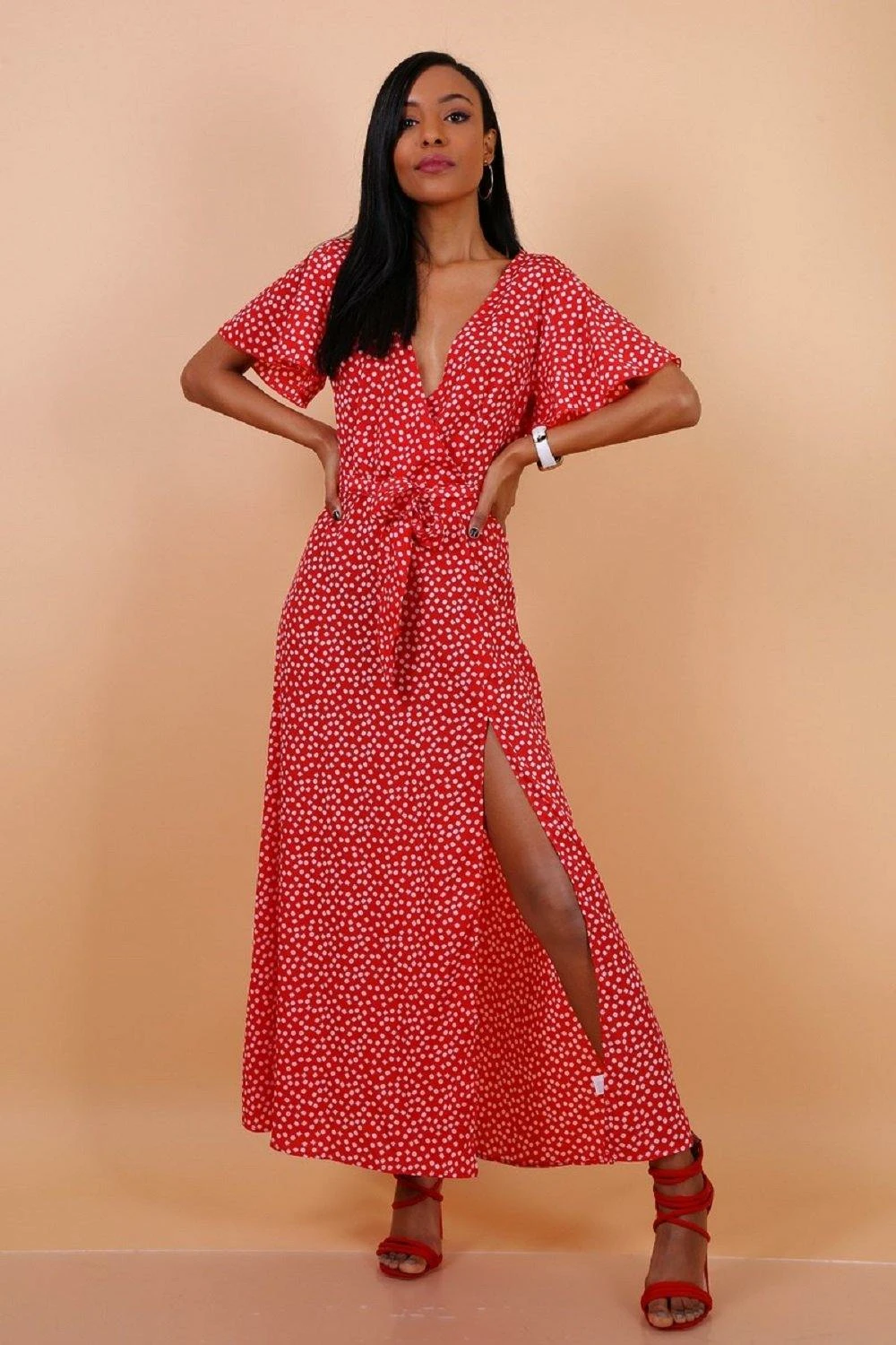 Update your summer-worthy wardrobe with this maxi dress. Featuring a red daisy dot print with a wrap design, plunge neckline, a tie waist and a leg split detail. Team with some strappy heels and a mini bag for day drinks with the girls.