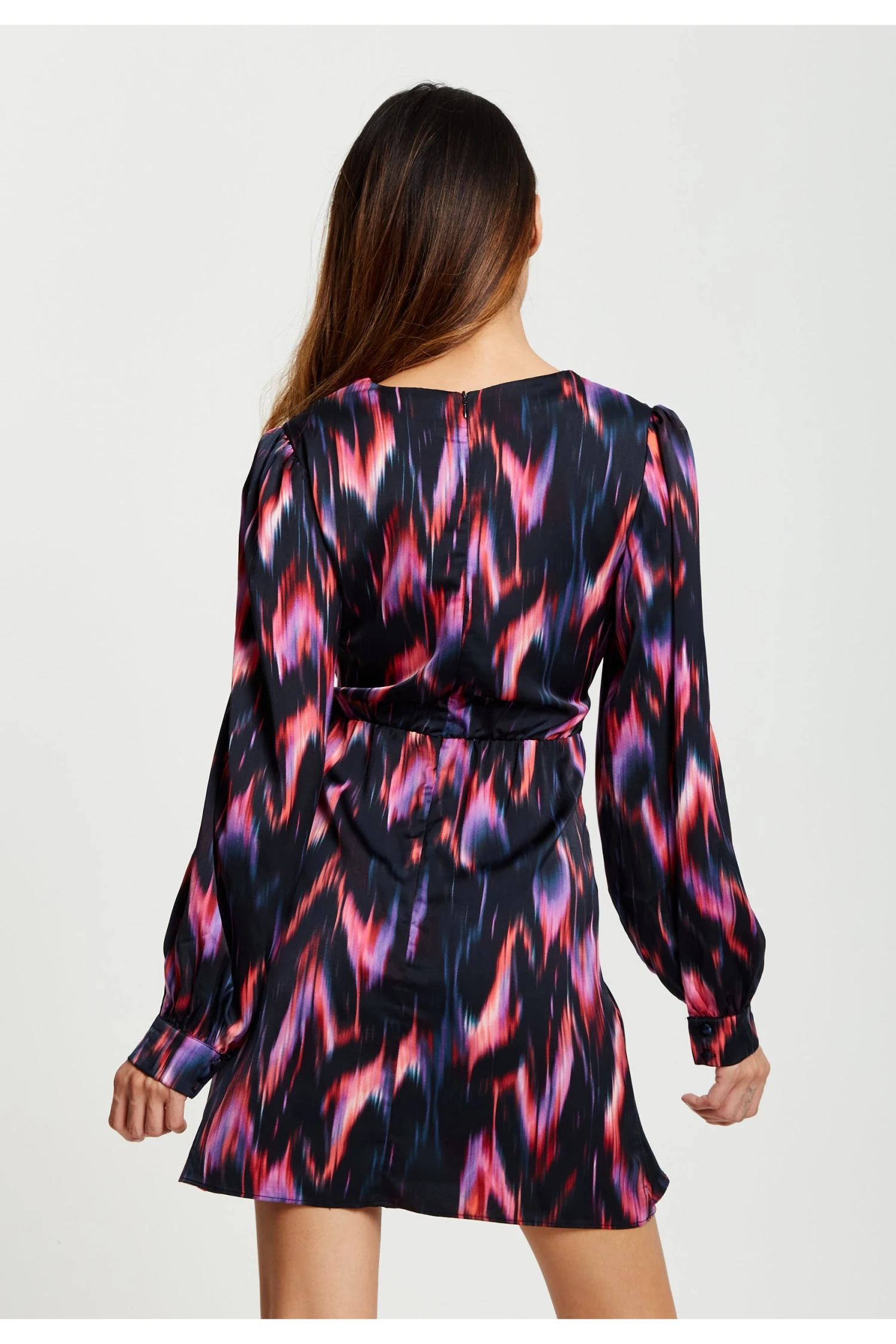 The perfect dress for Autumn nights! Featuring long sleeves but a mini length skirt it is perfect when paired with knee length boots and tights on cooler days or a pair of cute stiletto heels for warmer ones. With details such as a wraparound, V neckline and balloon sleeves it is the perfect mix of class and sensuality. The abstract feather print has accents of warm vibrant colours which pop against a dark black backdrop.