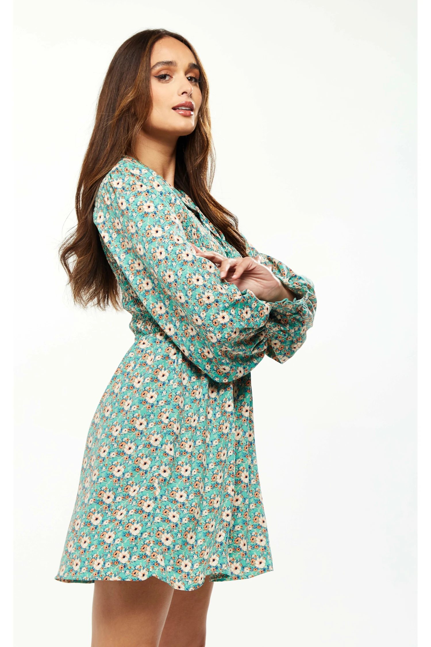 The Liquorish Floral Print Shirred Mini Dress with Peter Pan Collar in Green. Perfect for the child inside, this cutesy style will fly- get it before its gone!