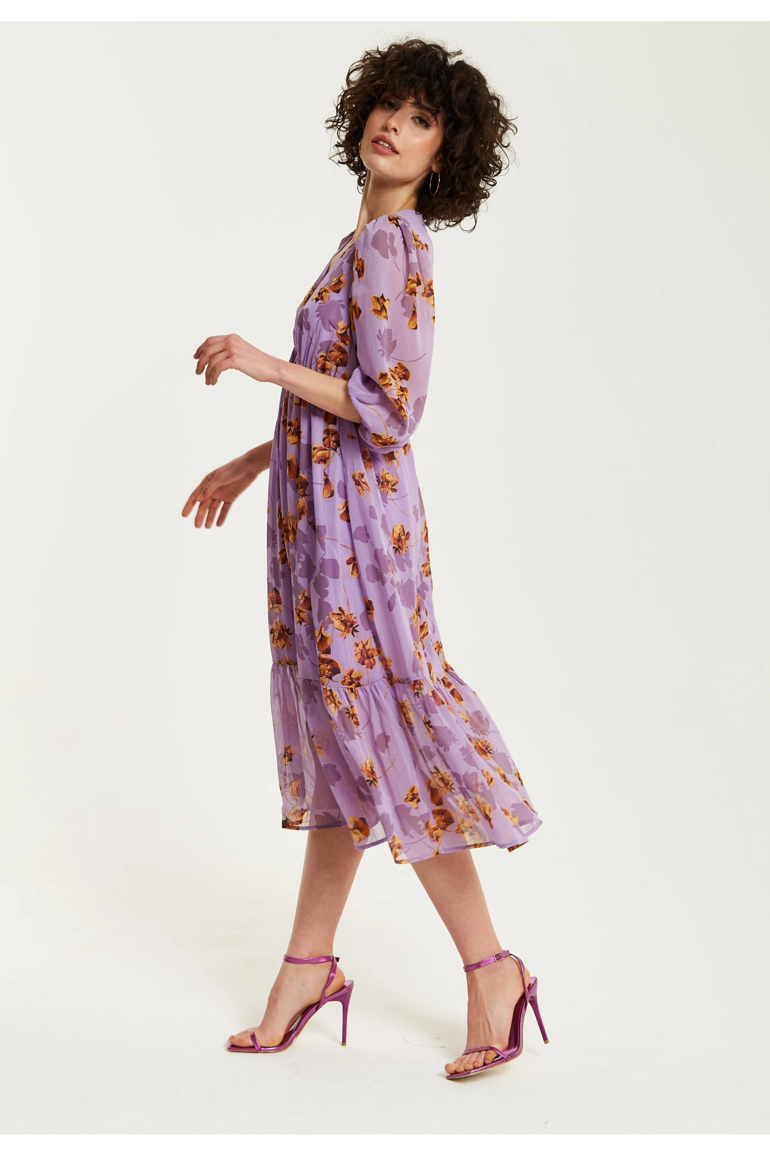 Purple floral V-neck midi dress with purple floral print and kimono sleeves.
