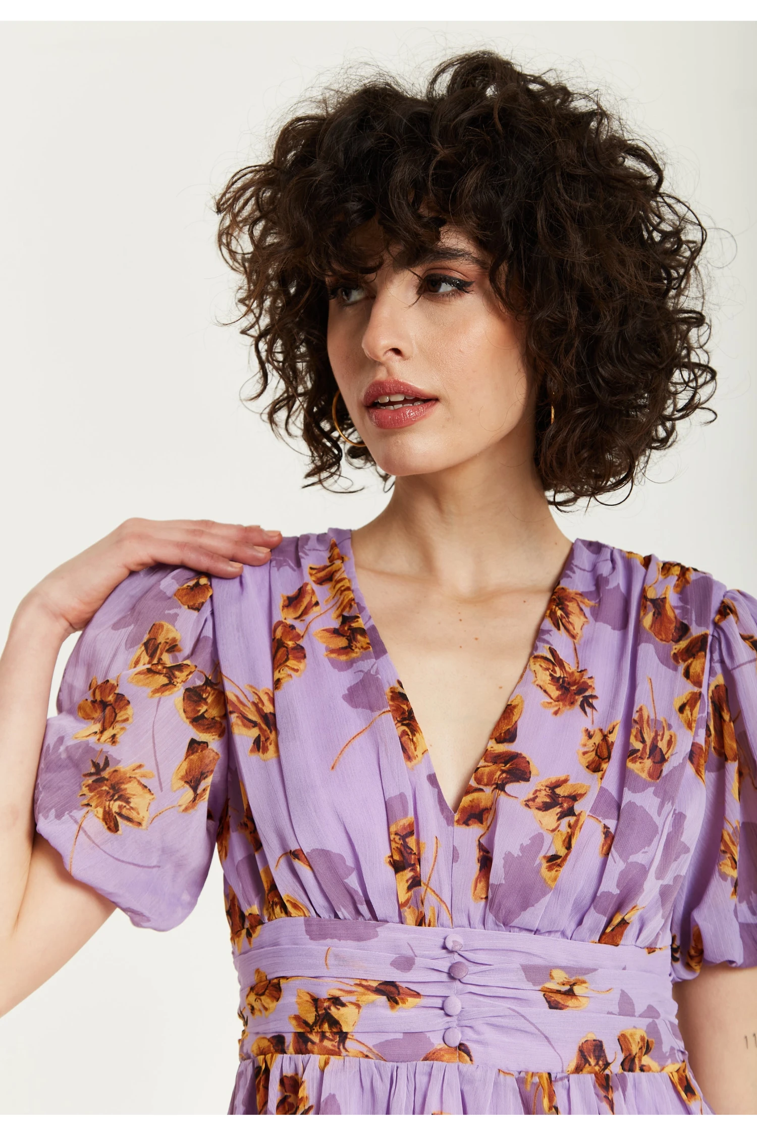 Purple floral mini dress with deep v-neck and button waistband.