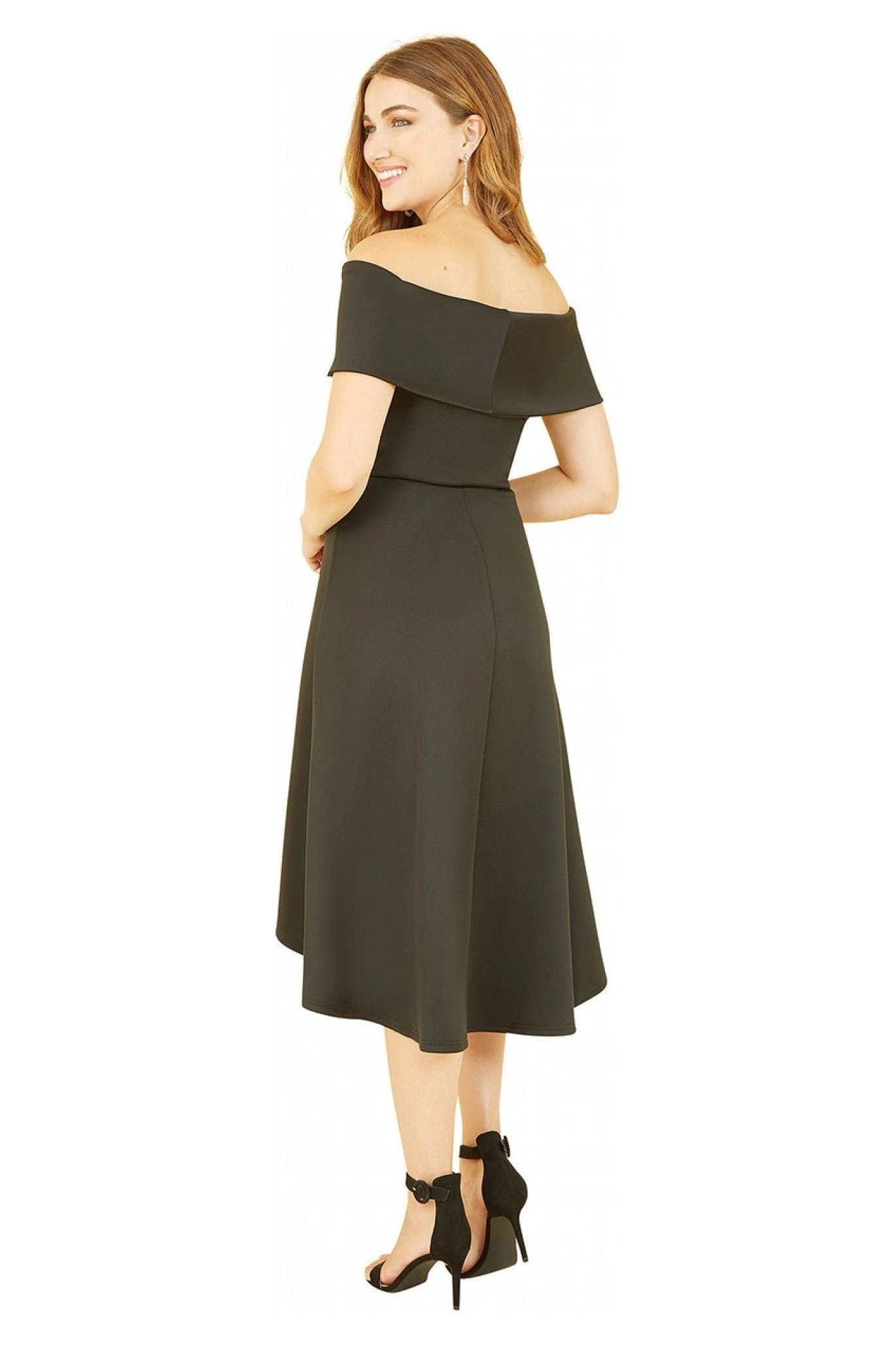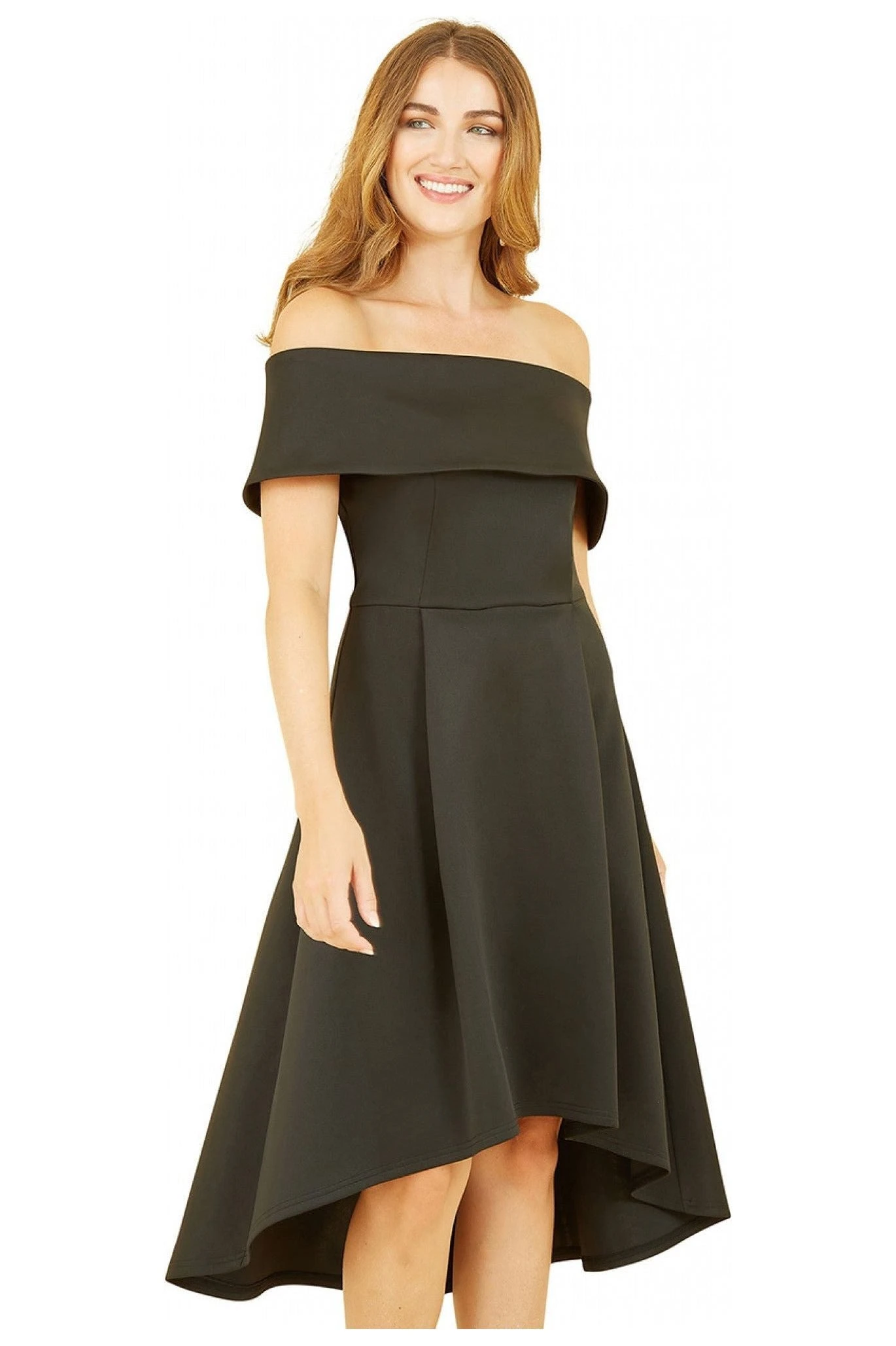 The Mela Black Bardot Dipped Hem Dress is calling to be worn for all the special occasions this season. The fold over Bardot neckline is flattering and the shape overall is enhanced by the cinched in bodice and skater style skirt that has a dipped back.