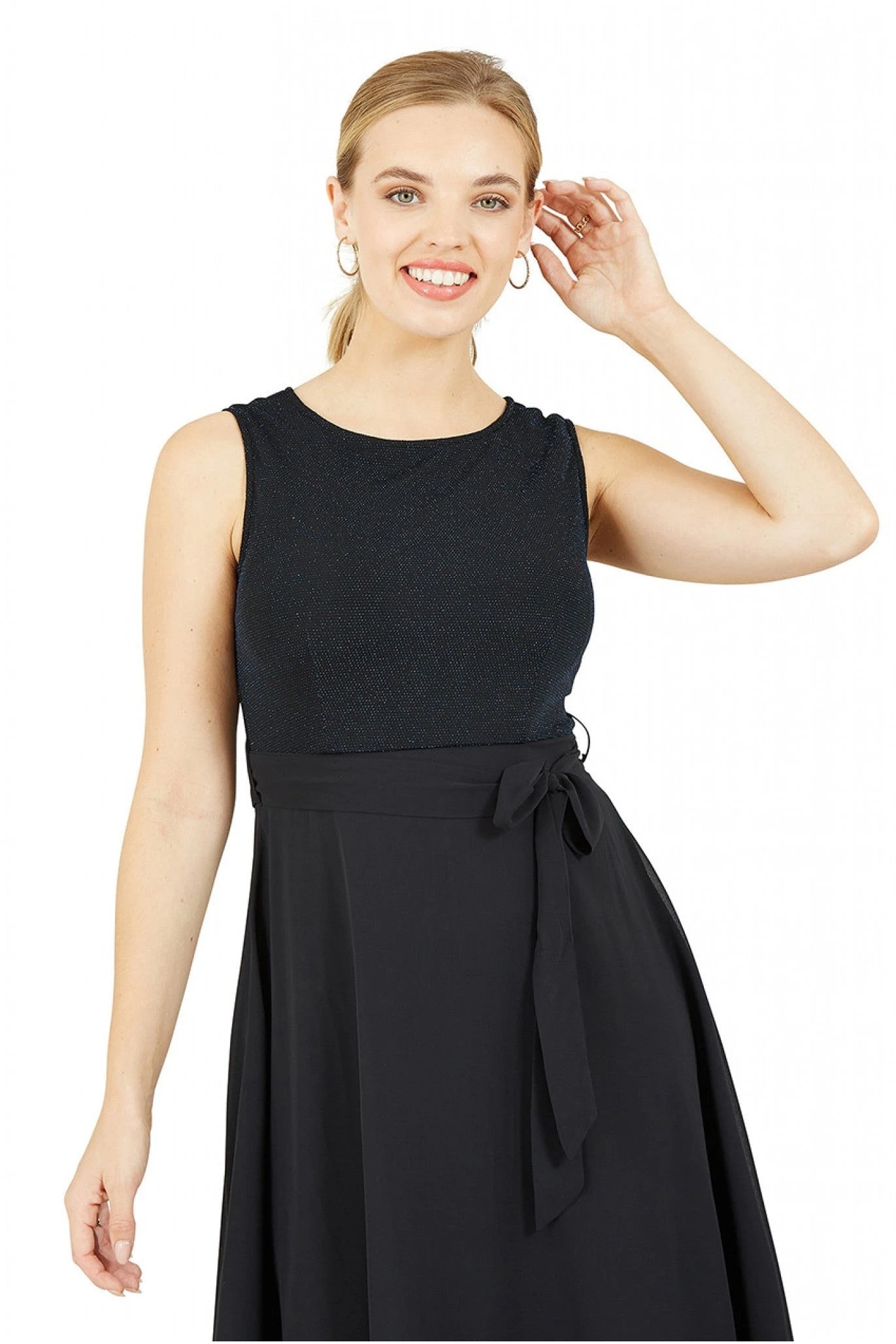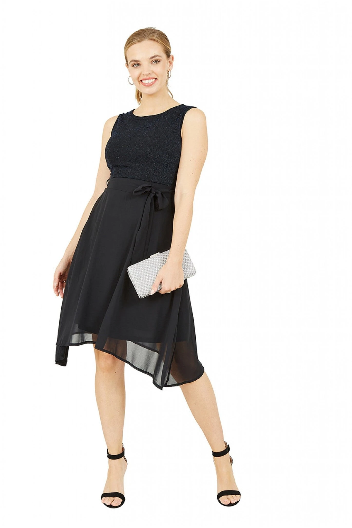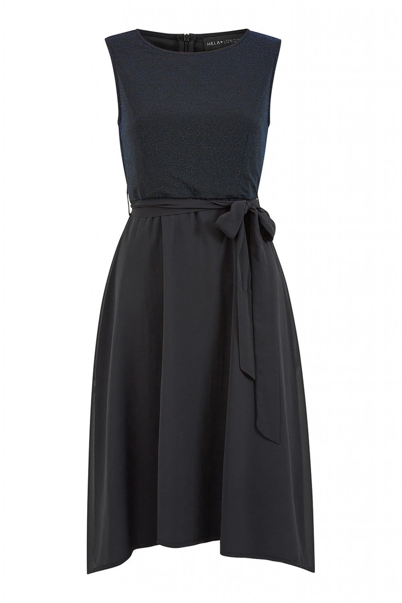 Elegant and flattering, this Mela Blue Sparkle Dress with Woven Skirt is