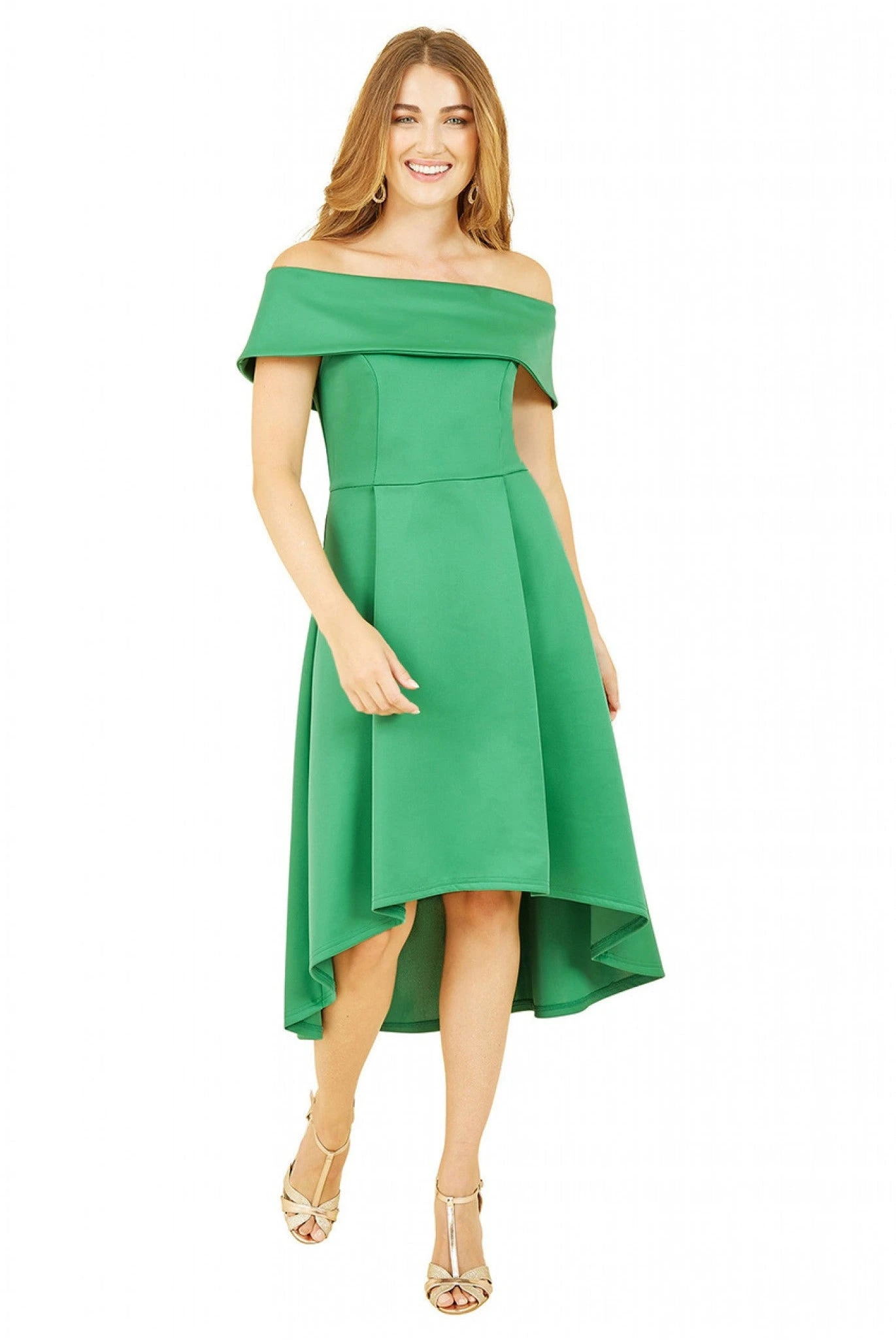 The Mela Bright Green Bardot Dipped Hem Dress is calling to be worn for all the special occasions this season. The fold over Bardot neckline is flattering and the shape overall is enhanced by the cinched in bodice and skater style skirt that has a dipped back.