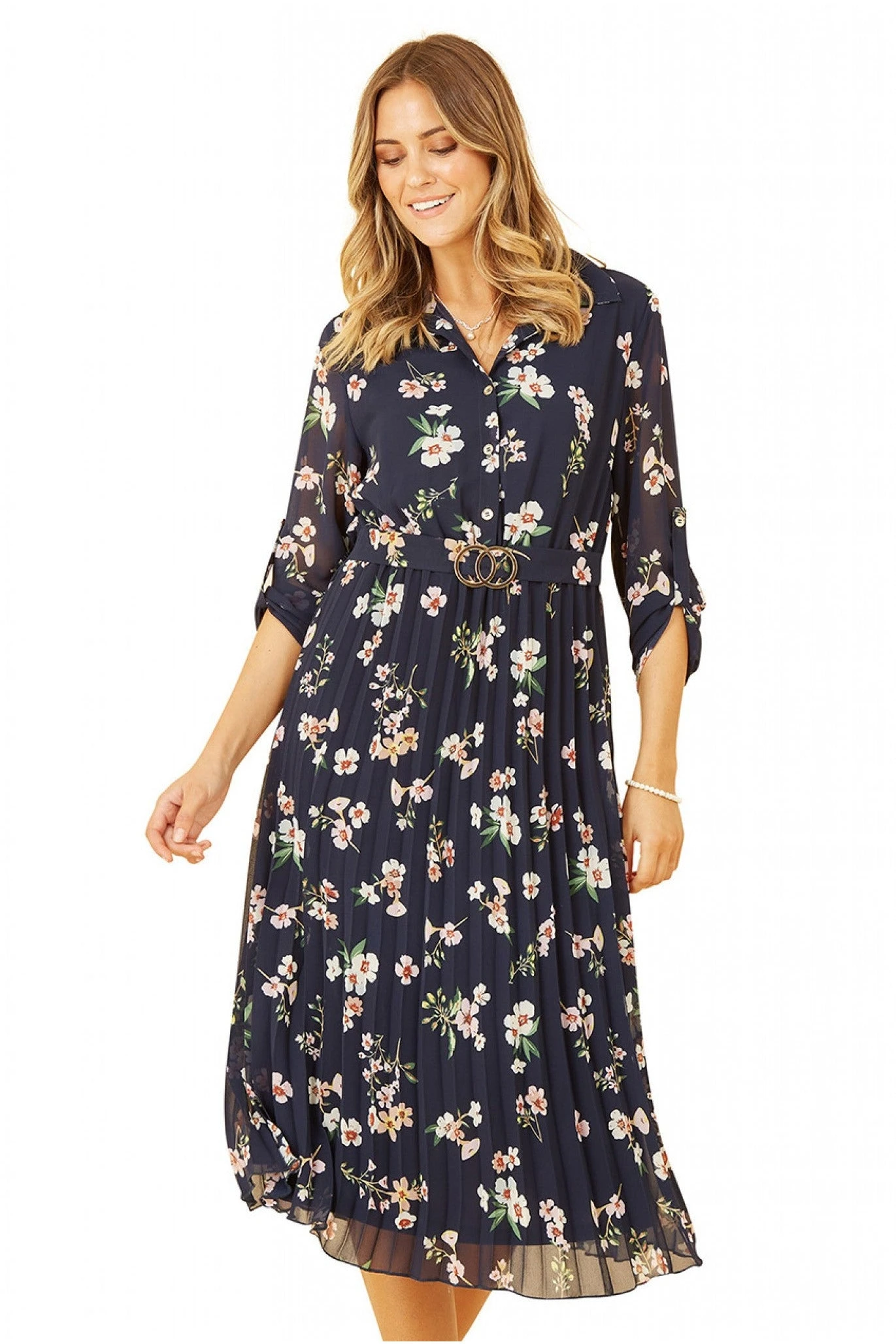 The pleated midi skirt, gold hardware and pretty floral print on this Mela dress is the only way to go for your plans. The button up front, 3/4 sleeves and with tie waist with the gold interlocked design belt has the ultimate workwear to weekend vibes.