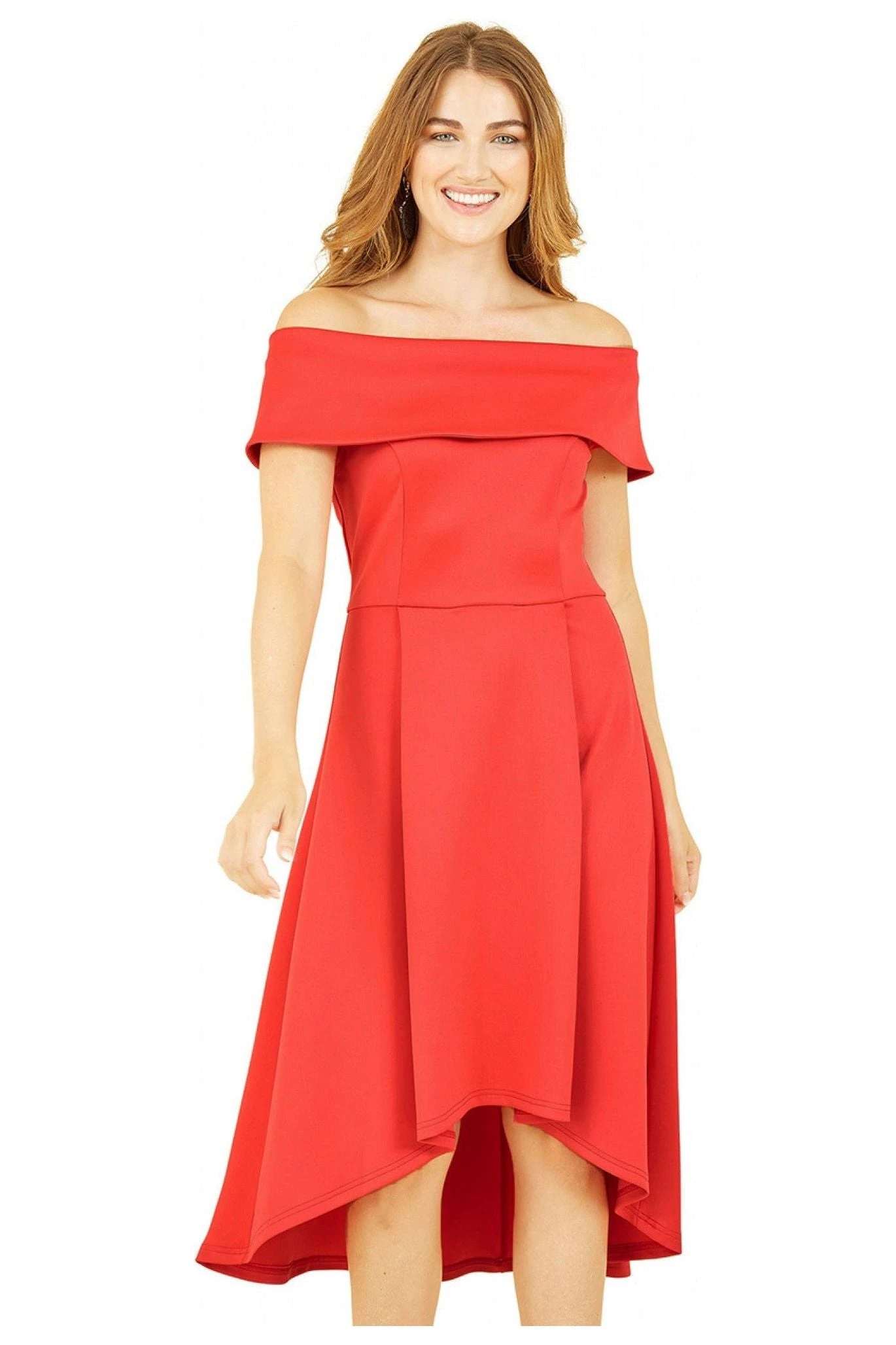 The Mela Red Bardot Dipped Hem Dress is calling to be worn for all the special occasions this season. The fold over Bardot neckline is flattering and the shape overall is enhanced by the cinched in bodice and skater style skirt that has a dipped back.