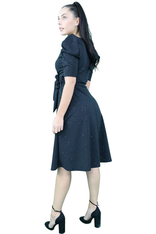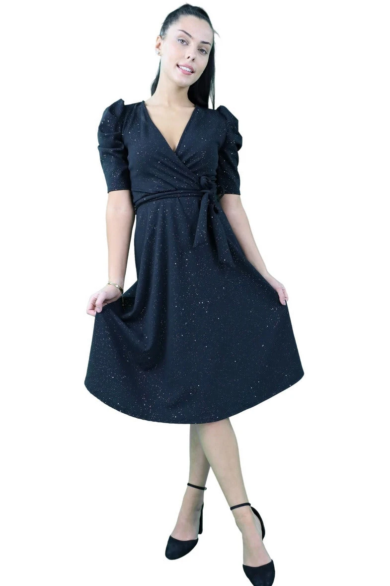 Black and Silver Gliter Wrap Puff Sleeve Midi Dress with Self fabric tie belt is Designed and Crafted to ensure you feel amazing, confident and desired in this new collection from Signage.