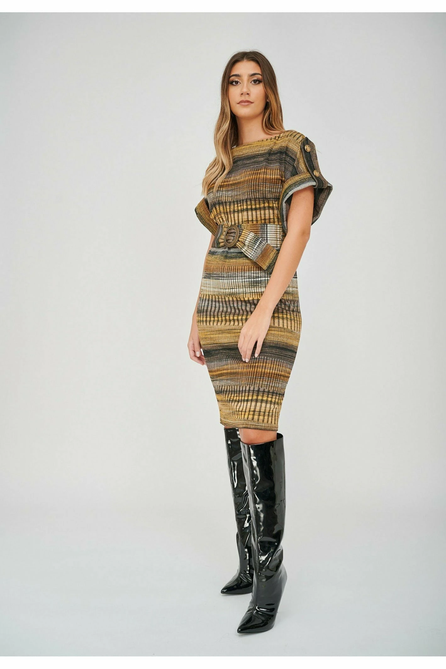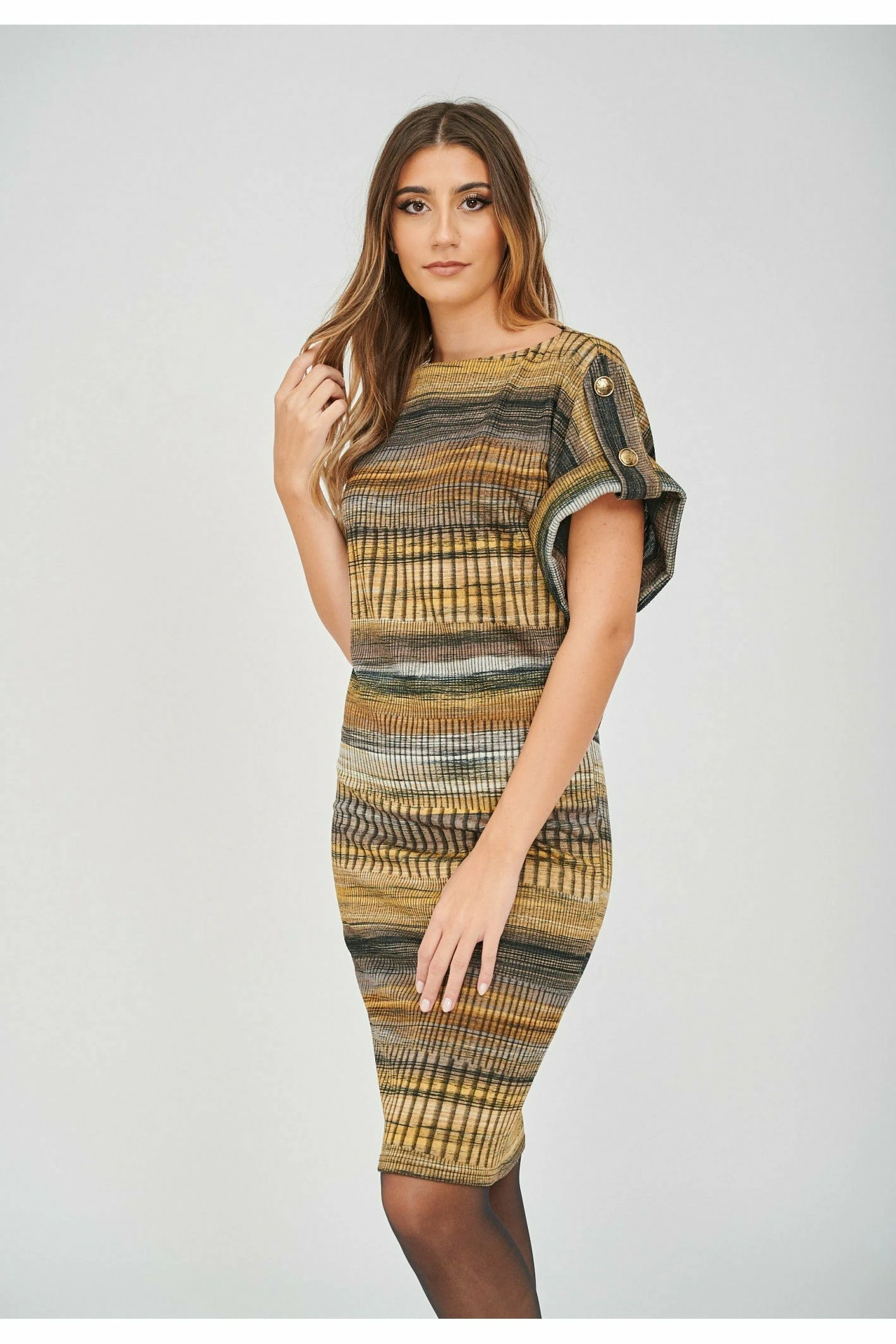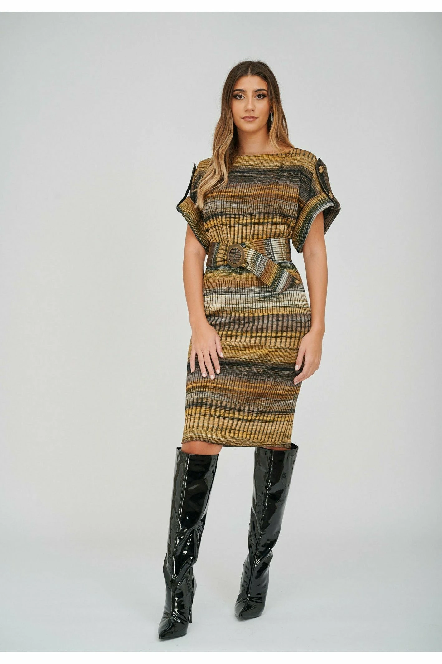This trans-seasonal dress is made in a printed stripe jacquard fabric. Rolled up raglan sleeves with epaulettes at the shoulders, embellished with antiqued brass buttons. The dress comes with matching fabric belt and an antiqued brass buckle to cinch in the waist. Easy wear dress that can be dressed up for sexy glamour or dressed down chic. A relaxed fit on the body, if you want a more fitted look we recommend going a size down.
