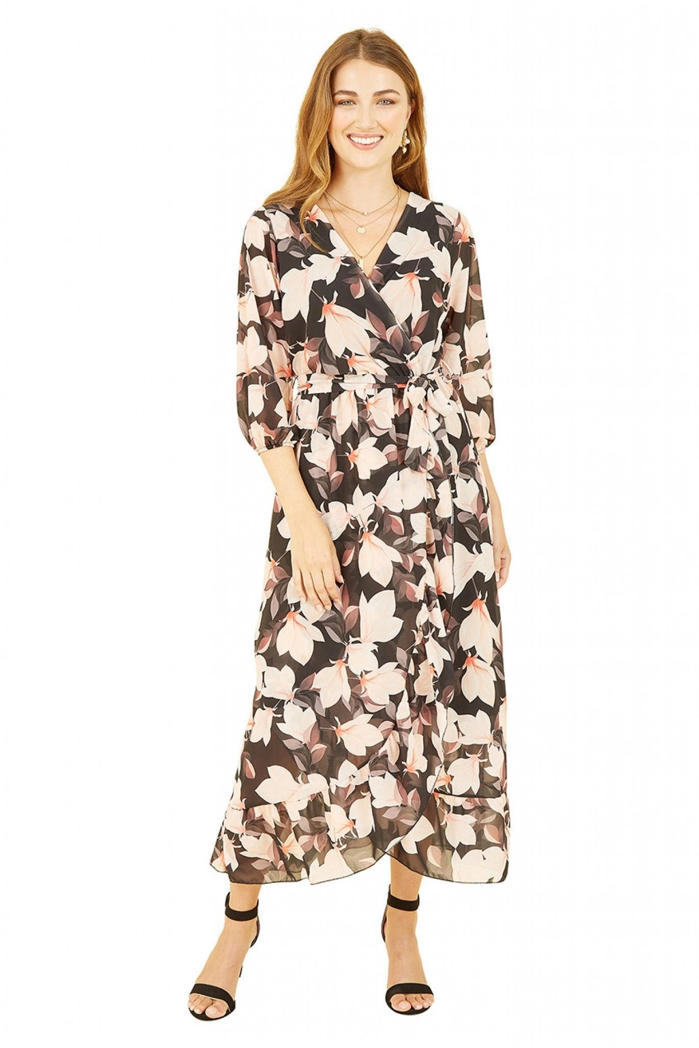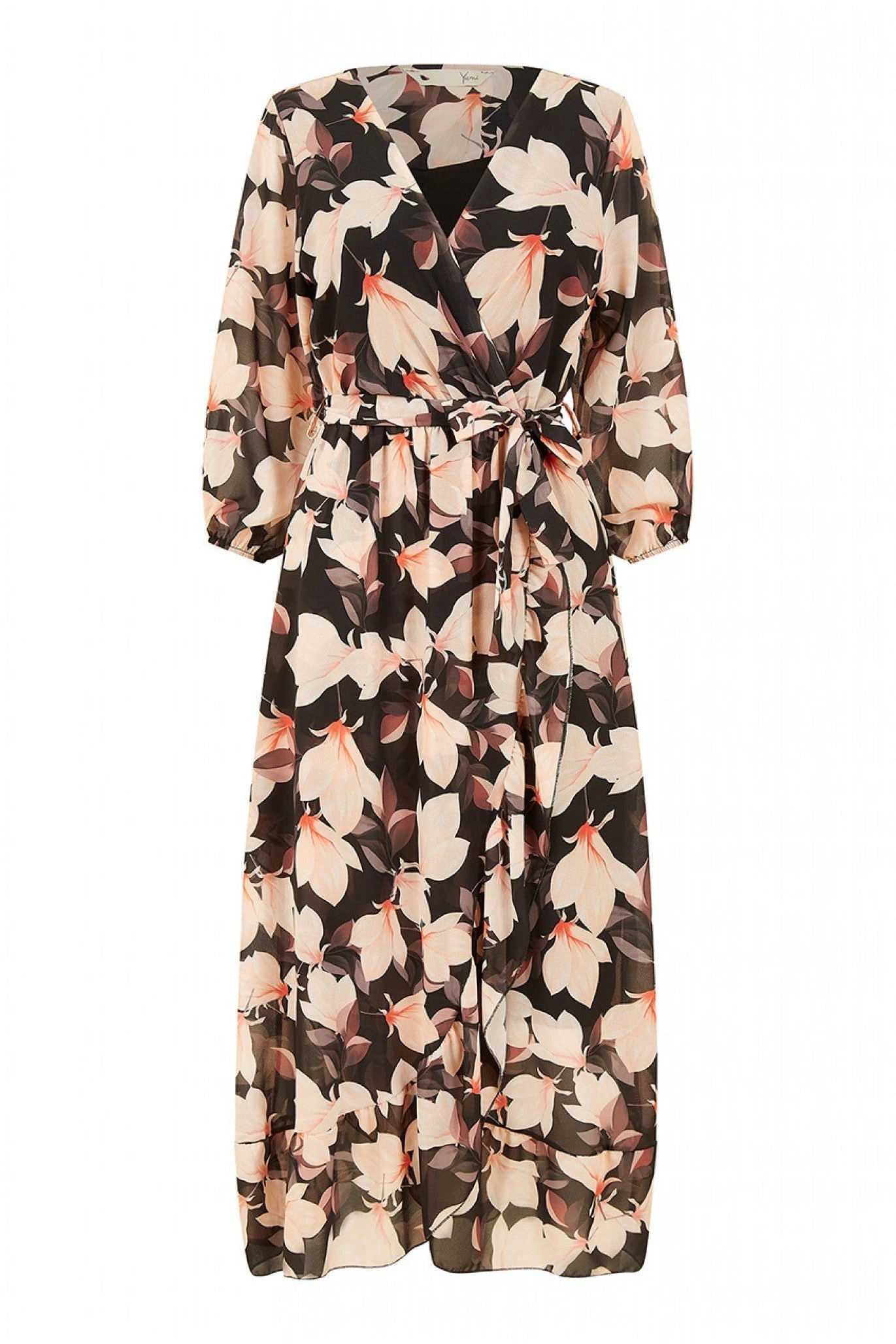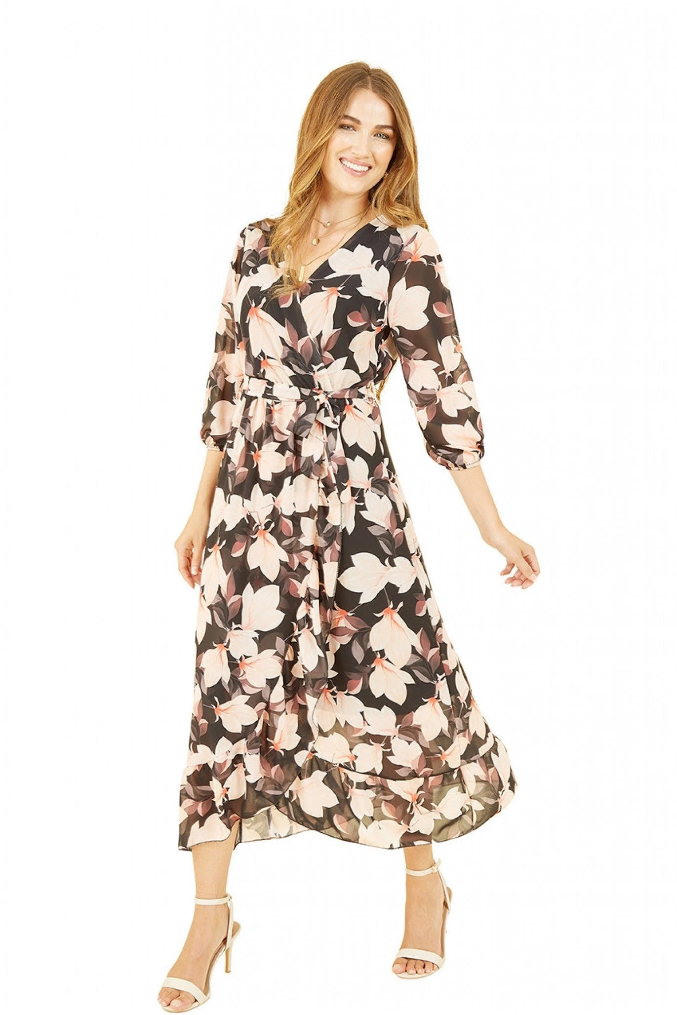 Let your style bloom this season in the Yumi Black Blossom print, perfect for wedding invites and fancy events. With a wrap around shape, midi length and 3/4 sleeves this is a great wardrobe update for the spring. In a bold all over blossom print, this unique dress requires simple styling, try gold jewellery and strappy sandals for a timeless look.
