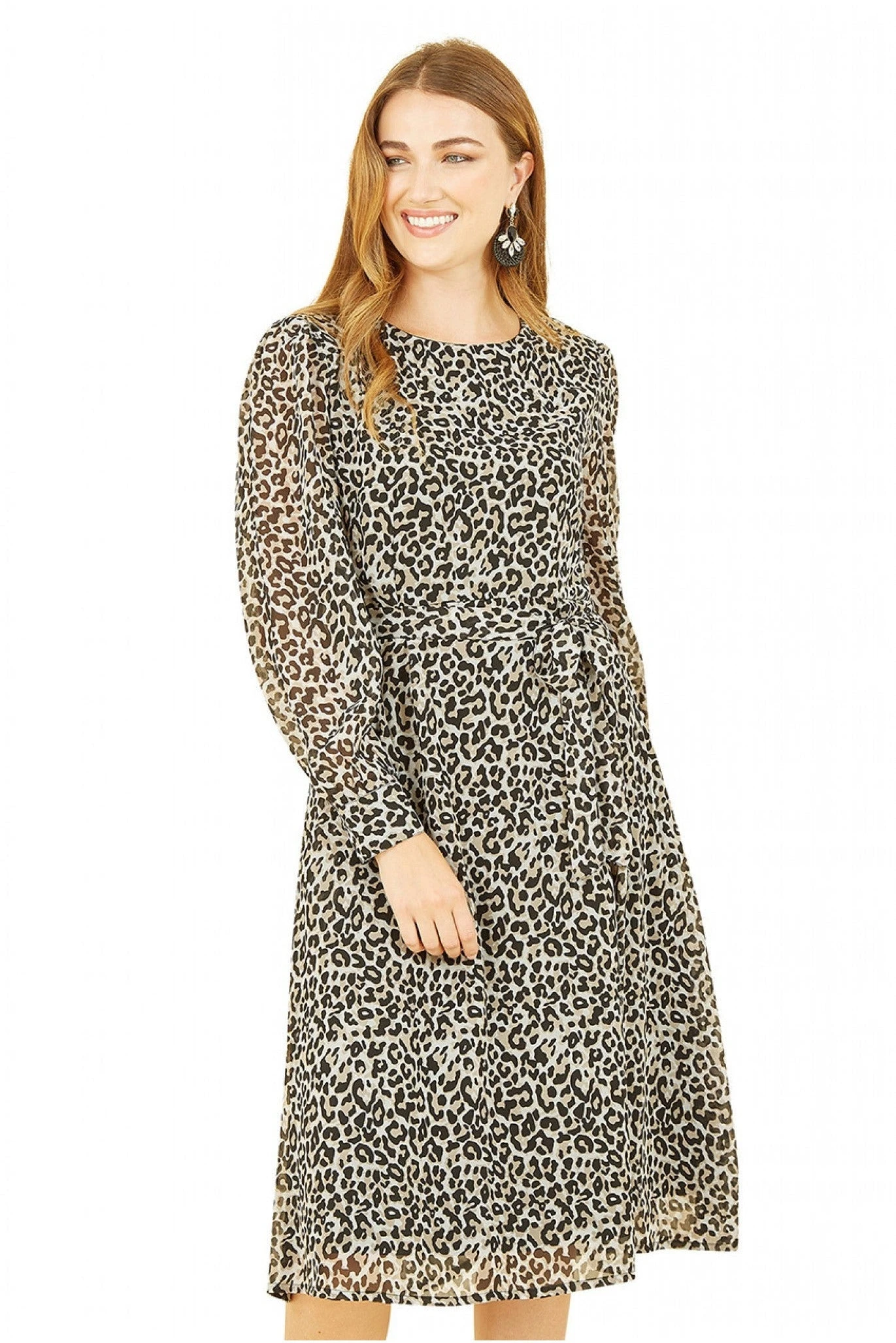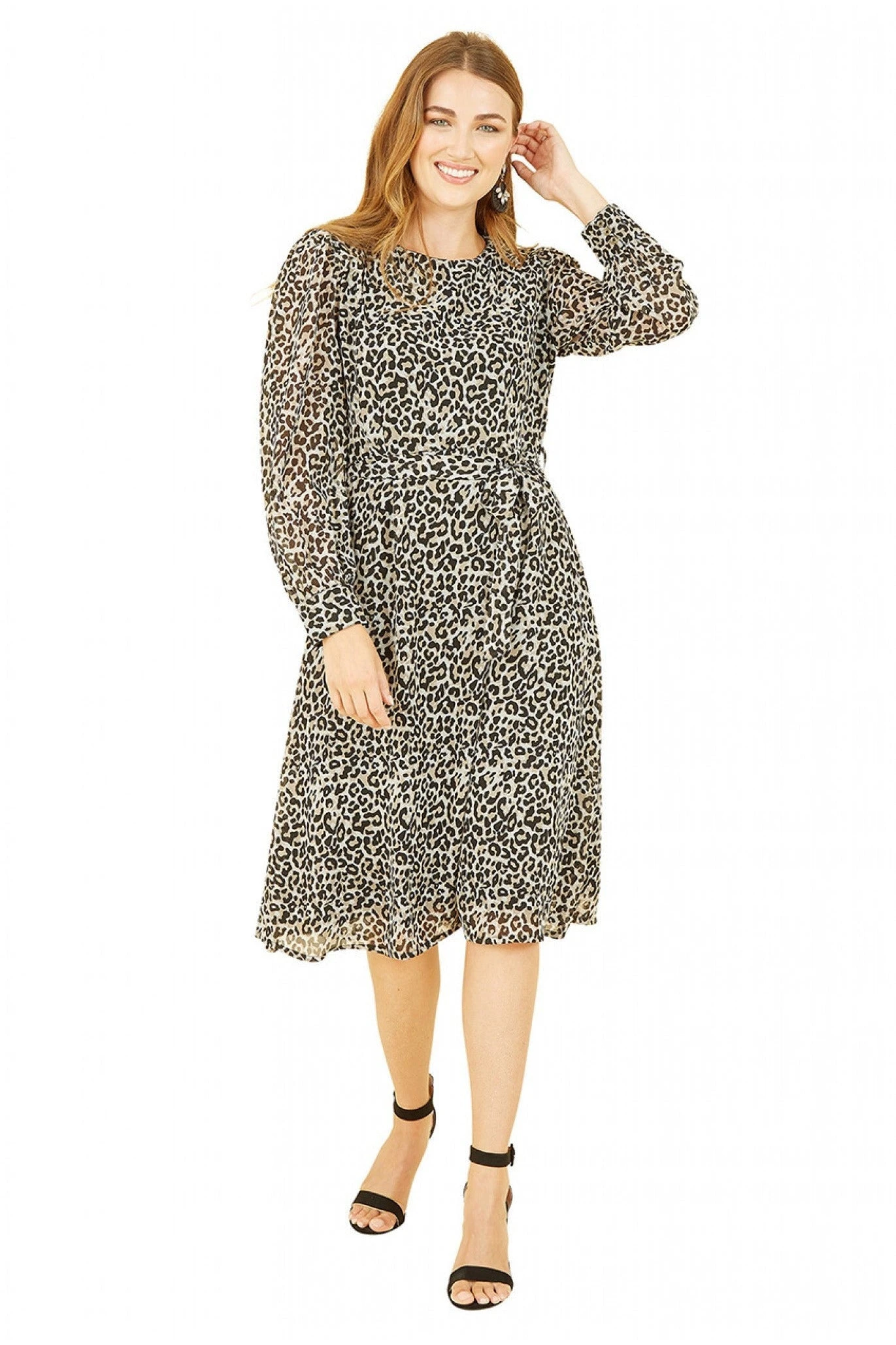This Yumi Black Leopard Long Sleeve Skater Dress will have you looking stylish from work to weekend. The simple skater shape is timeless, with a self tie belt, round neckline and concealed back zipper.