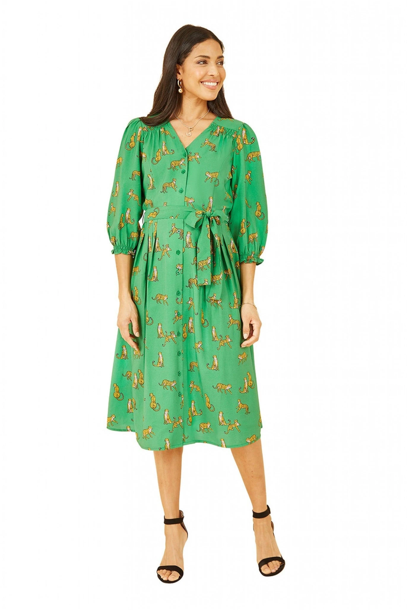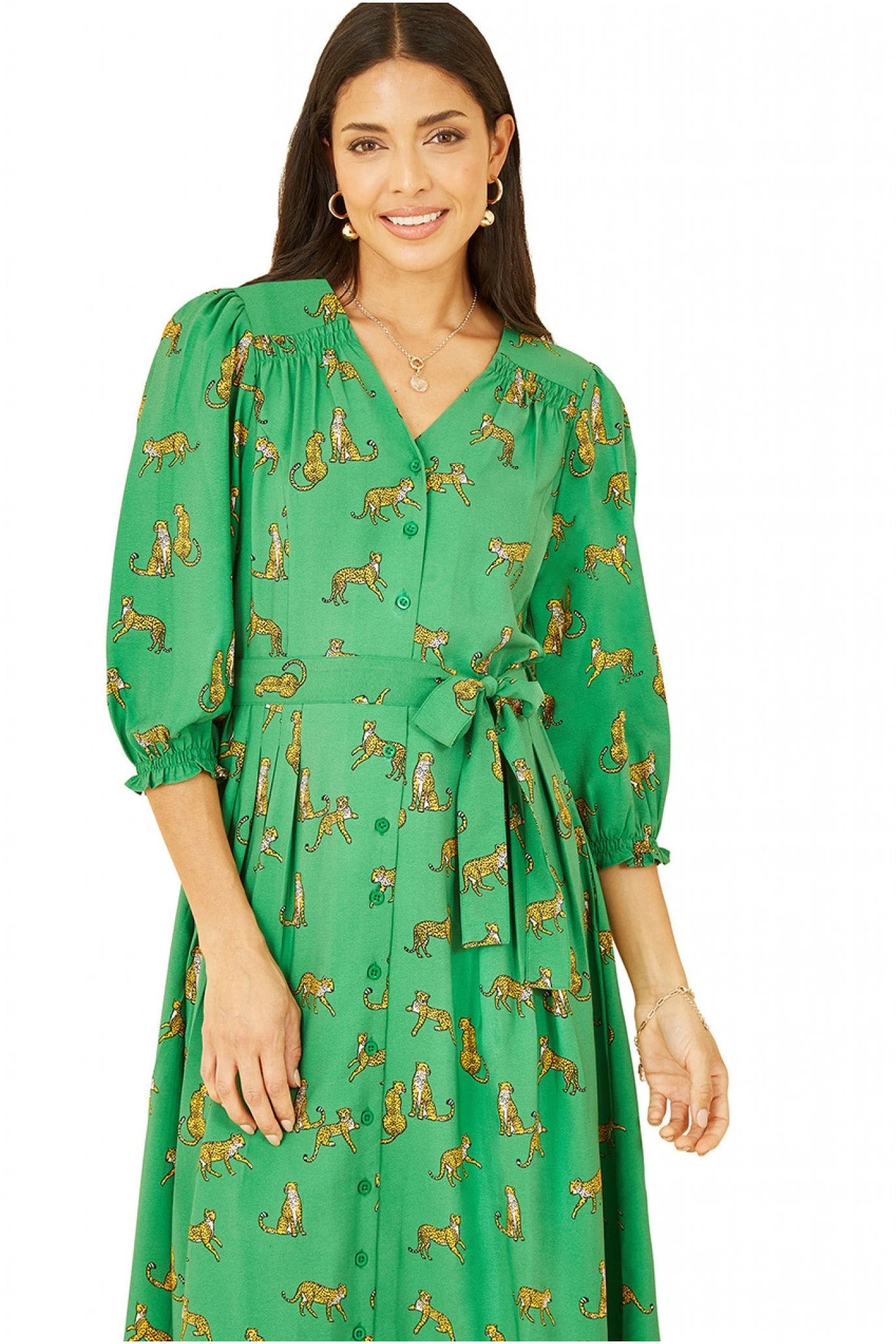 In striking green with Cheetah animal print, we know you’ll be embracing your wild side in this button up dress. With a 3/4 sleeve, that is ruched at the cuff, midi length hem and self tie waist, this Yumi designed piece is perfect for standing out from the crowd.