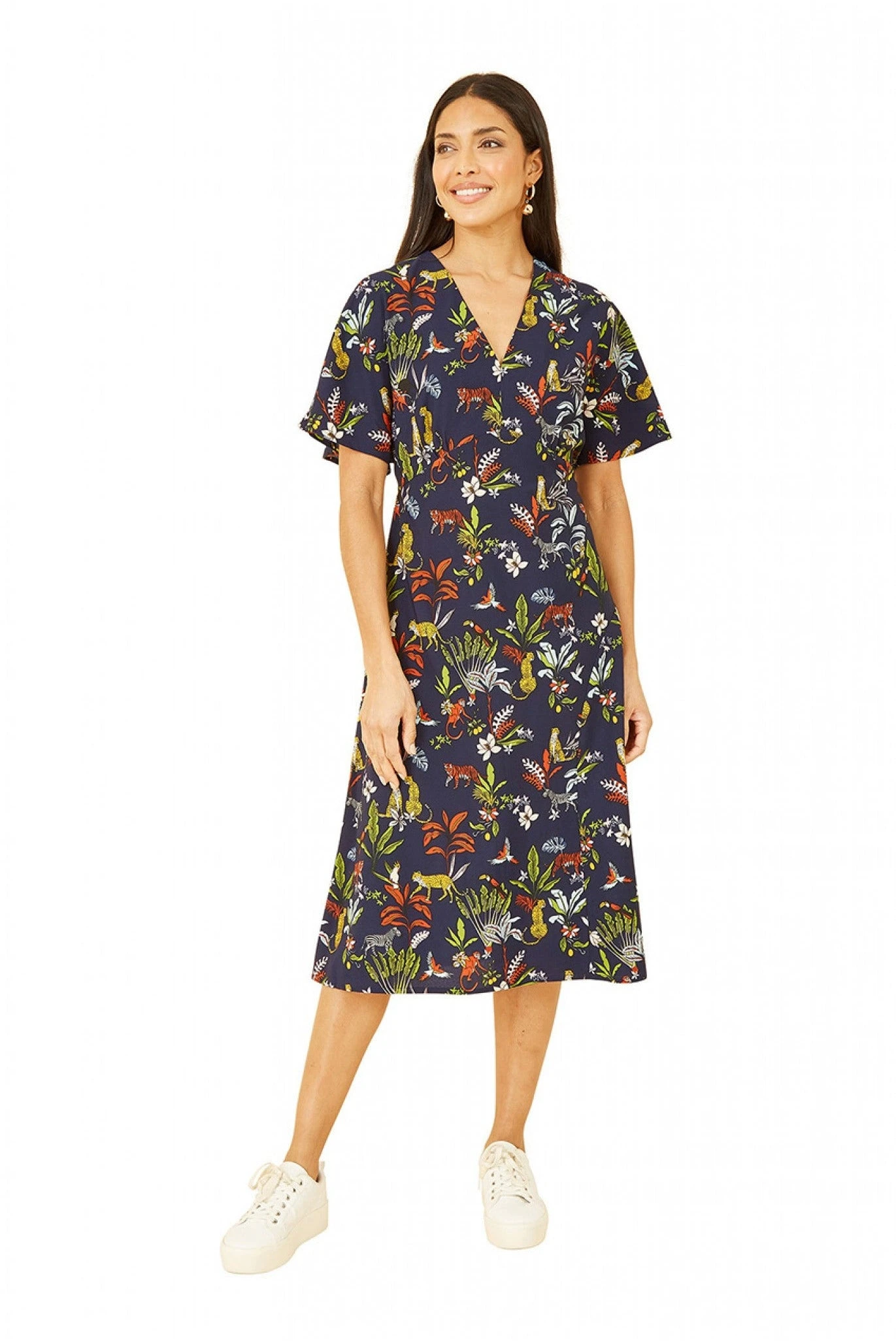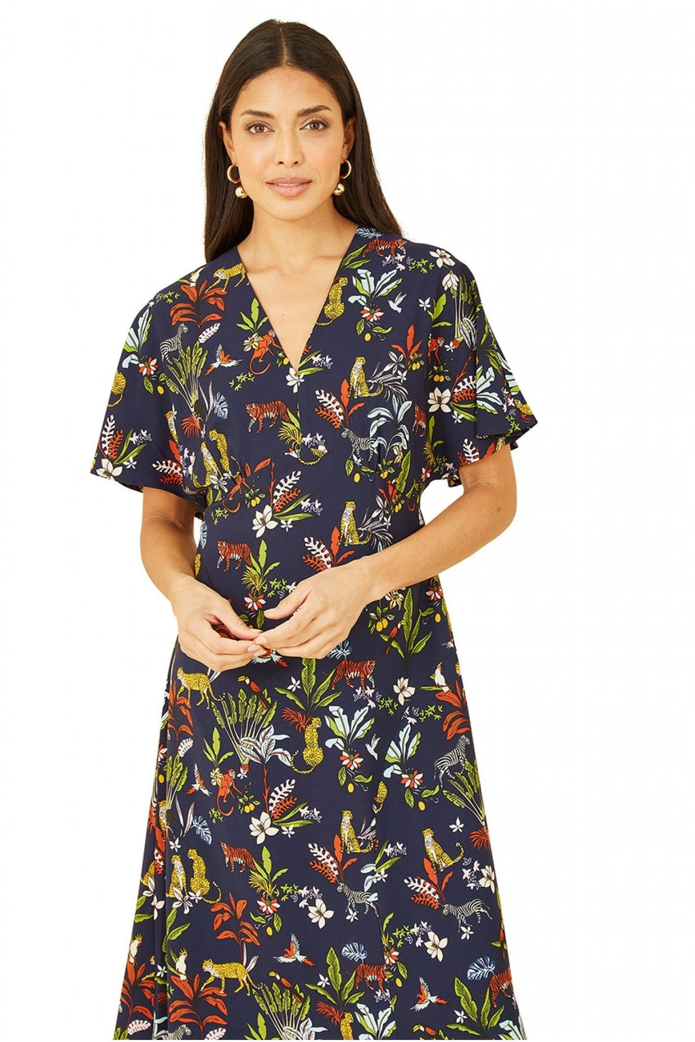 Step into spring/summer styles in this stunning midi dress by Yumi. Complete with statement angel sleeves and covered in an all-over jungle print, this midi dress flatters your figure with its loose fit and unique design. Pair with leather or denim.