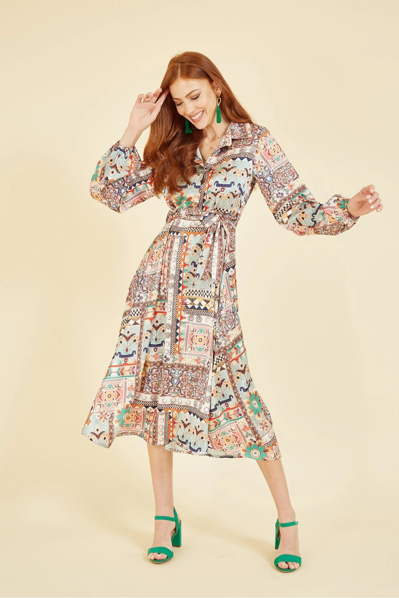 The intricate patchwork print on this Yumi midi dress is one to stop you in your tracks. The boho feel of this piece are encapsulated in a stunning button down style, with a balloon sleeve that cuffs at the wrist. With a self tie waist to add some structure, perfect for summer in natural hues with a stunning pop of mint to lift the whole design. Style for a casual fit with tan sandals and wicker bag, or amp up the look in heels and statement jewellery.