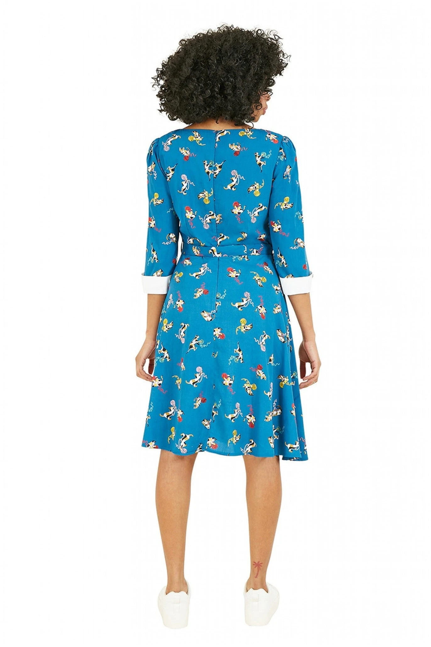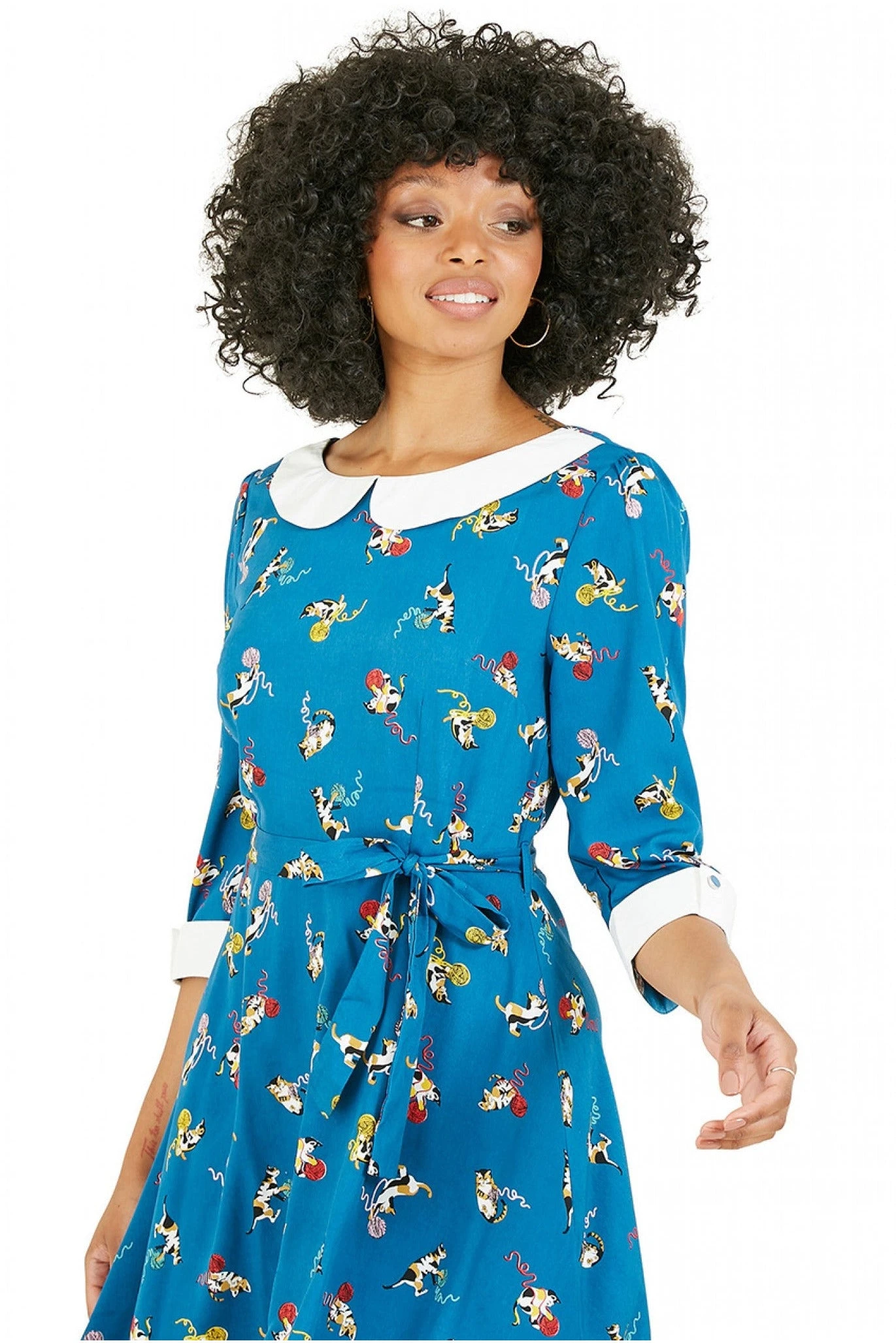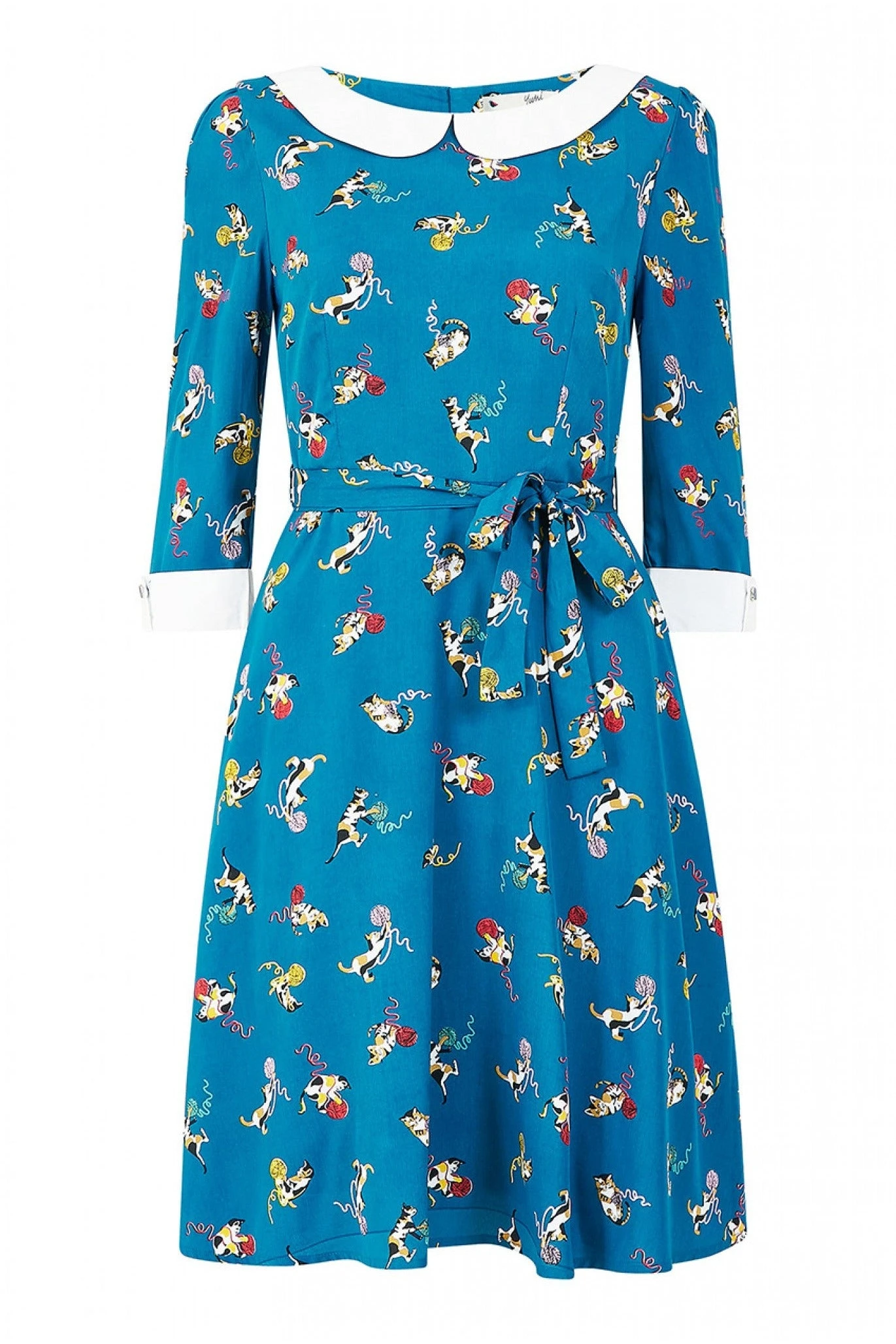 Keep it cute in this gorgeous Yumi Teal Cat And Wool Print Skater Dress.